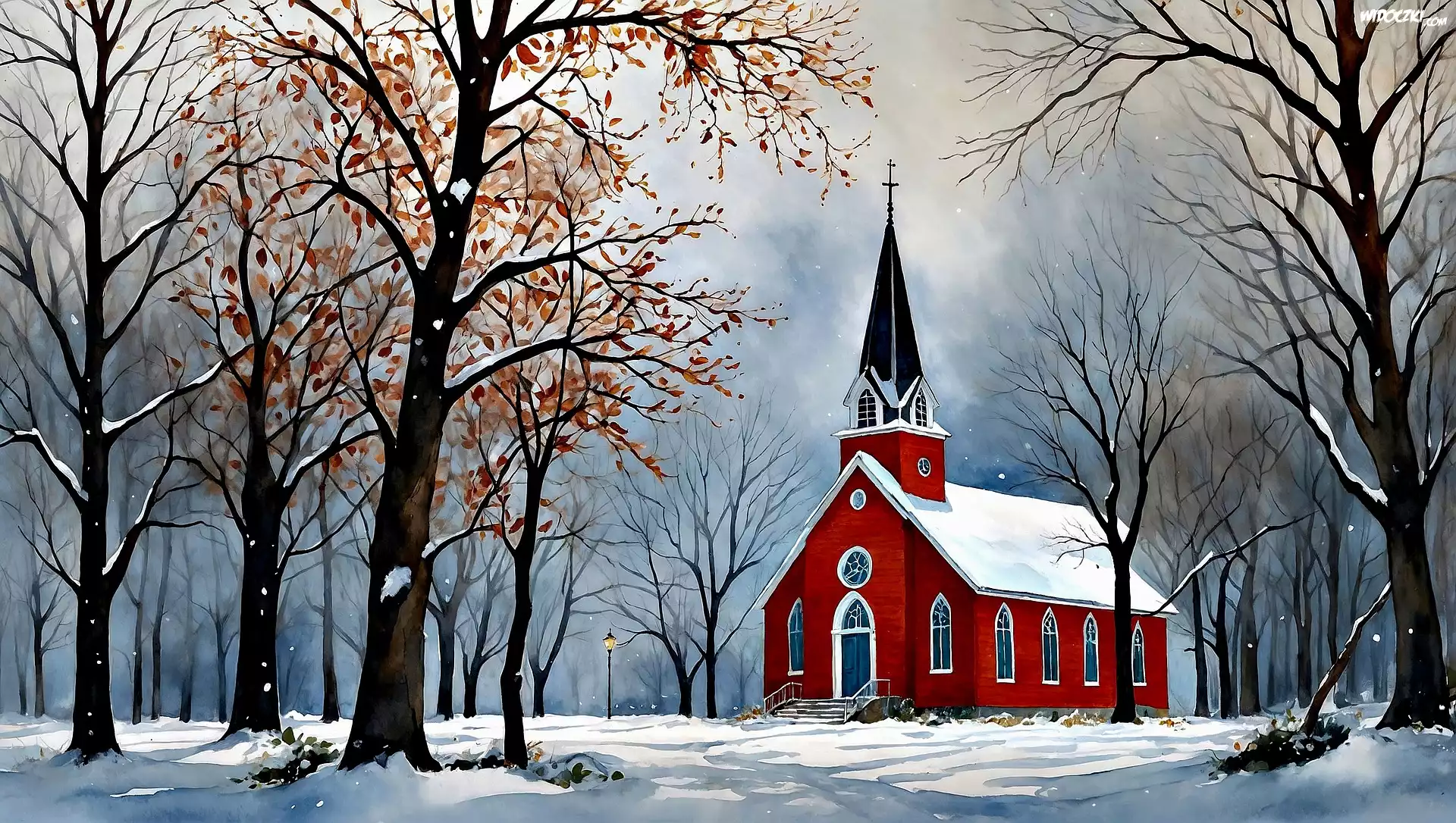 Zima, Kościół, Drzewa, Grafika