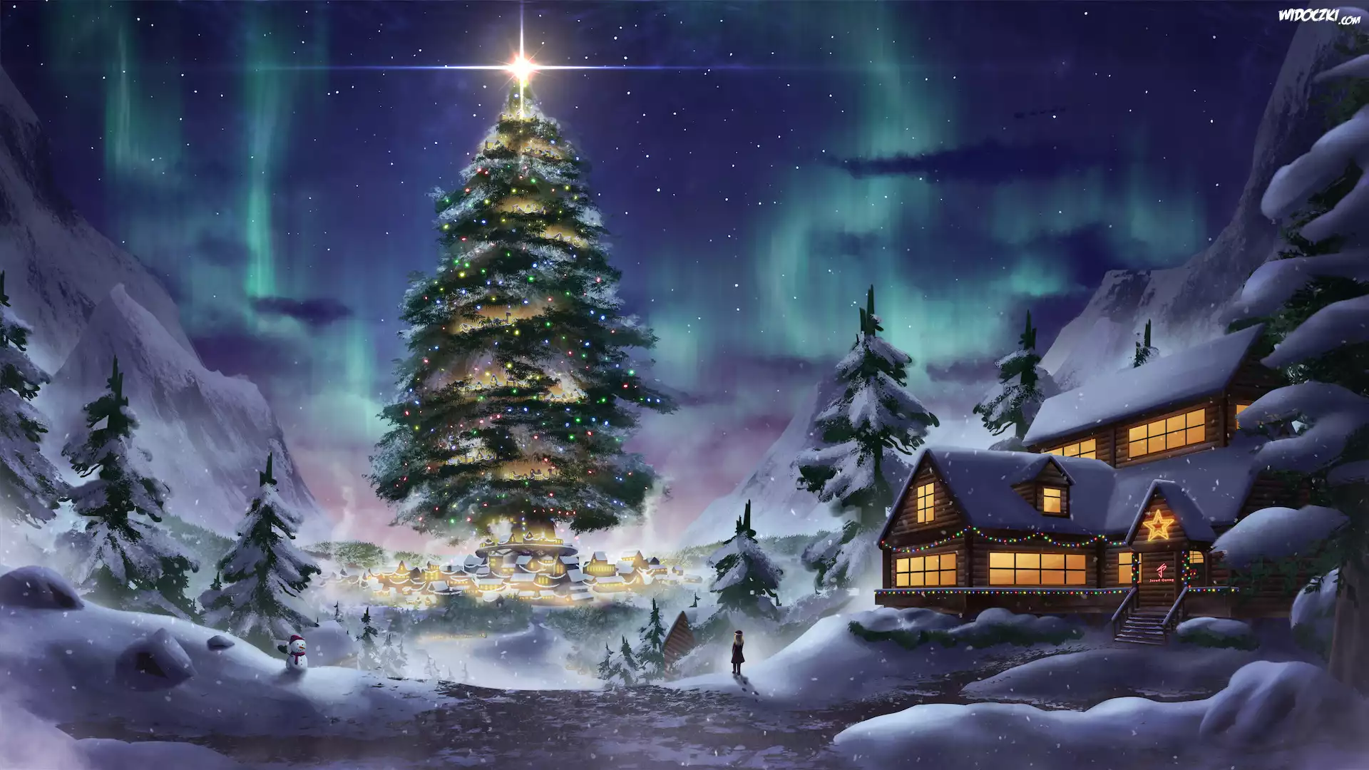 Zdjęcia, Grafika, Zima, Boże Narodzenie, Choinka, Domy, Zorza polarna, Śnieg