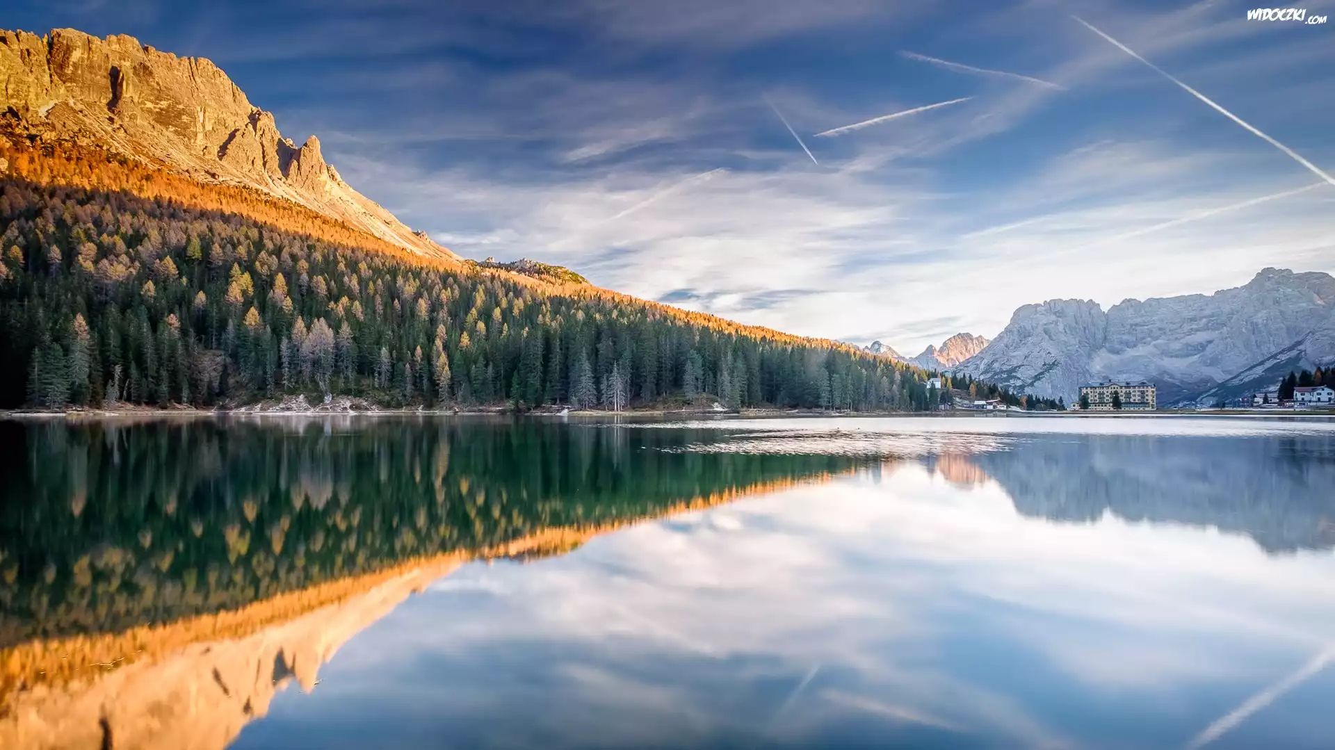 Góry, Dolomity, Jezioro, Misurina Lake, Las, Drzewa, Domy, Grand Hotel Misurina, Cortina dAmpezzo, Włochy |