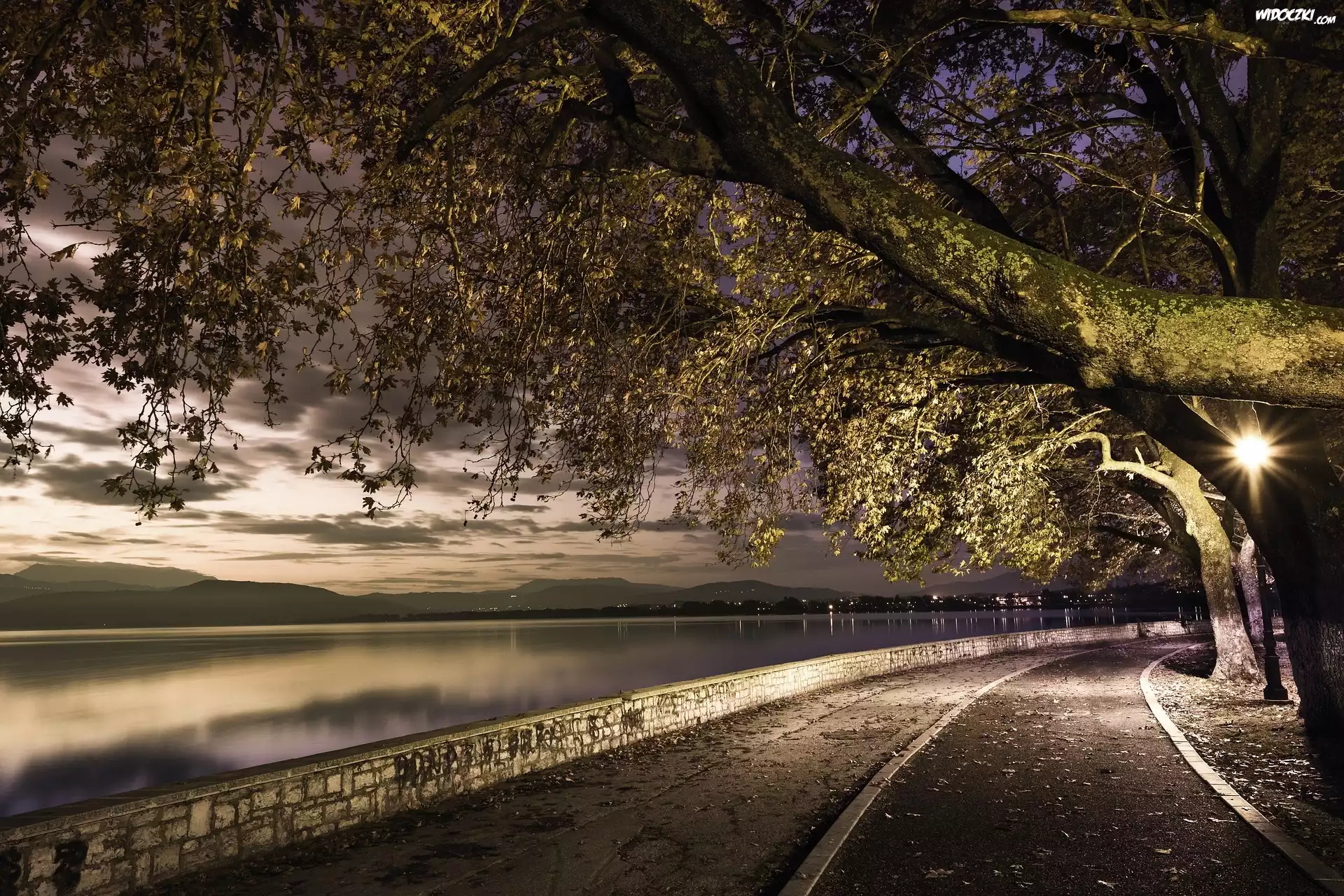 Zdjęcia, Jezioro Pamvotida, Bulwar, Zmierzch, Drzewa, Latarnia, Miejscowość Janina, Joanina, Grecja