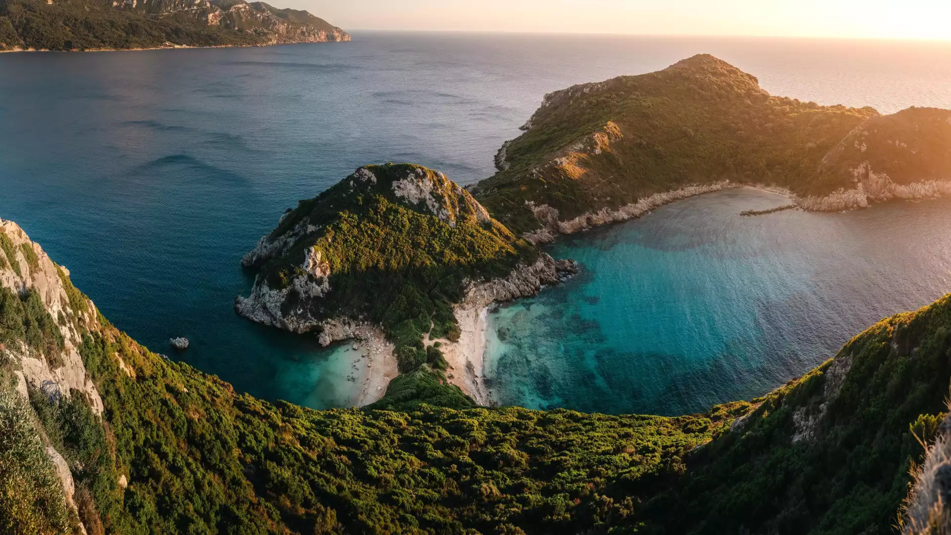 Grecja, Wyspa Korfu, Wybrzeże, Góry, Zatoki, Morze, Zachód Słońca