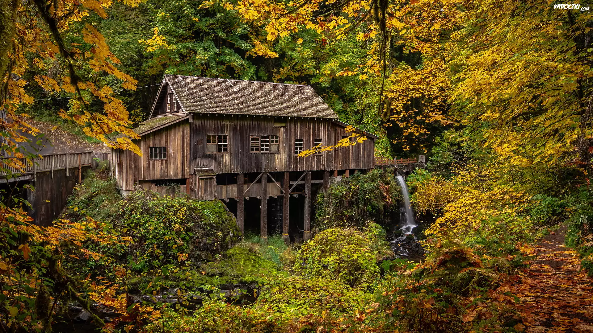 Jesień, Młyn Cedar Creek Grist Mill, Rzeka, Drzewa, Las, Woodland, Stan Waszyngton, Stany Zjednoczone |