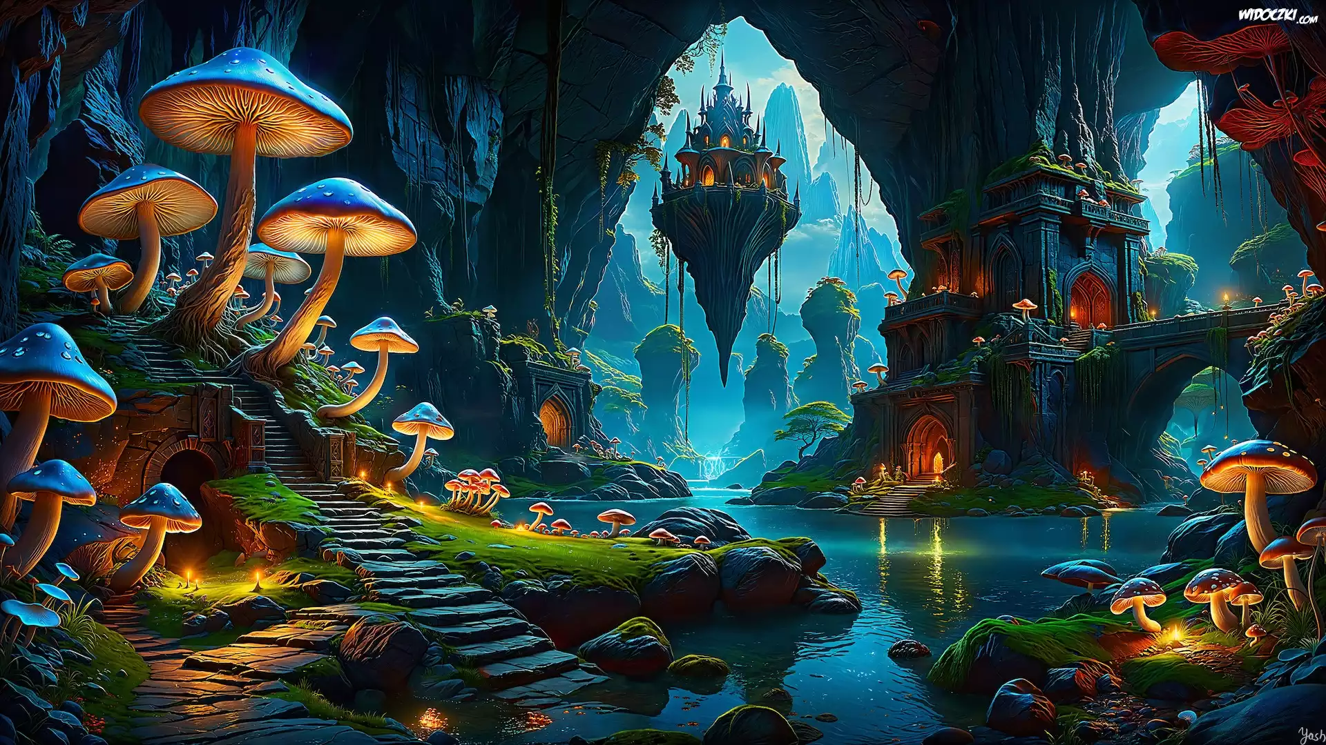 Zdjęcia, Rzeka, Jaskinia, Drzewa, Grzyby, Schody, Fantasy