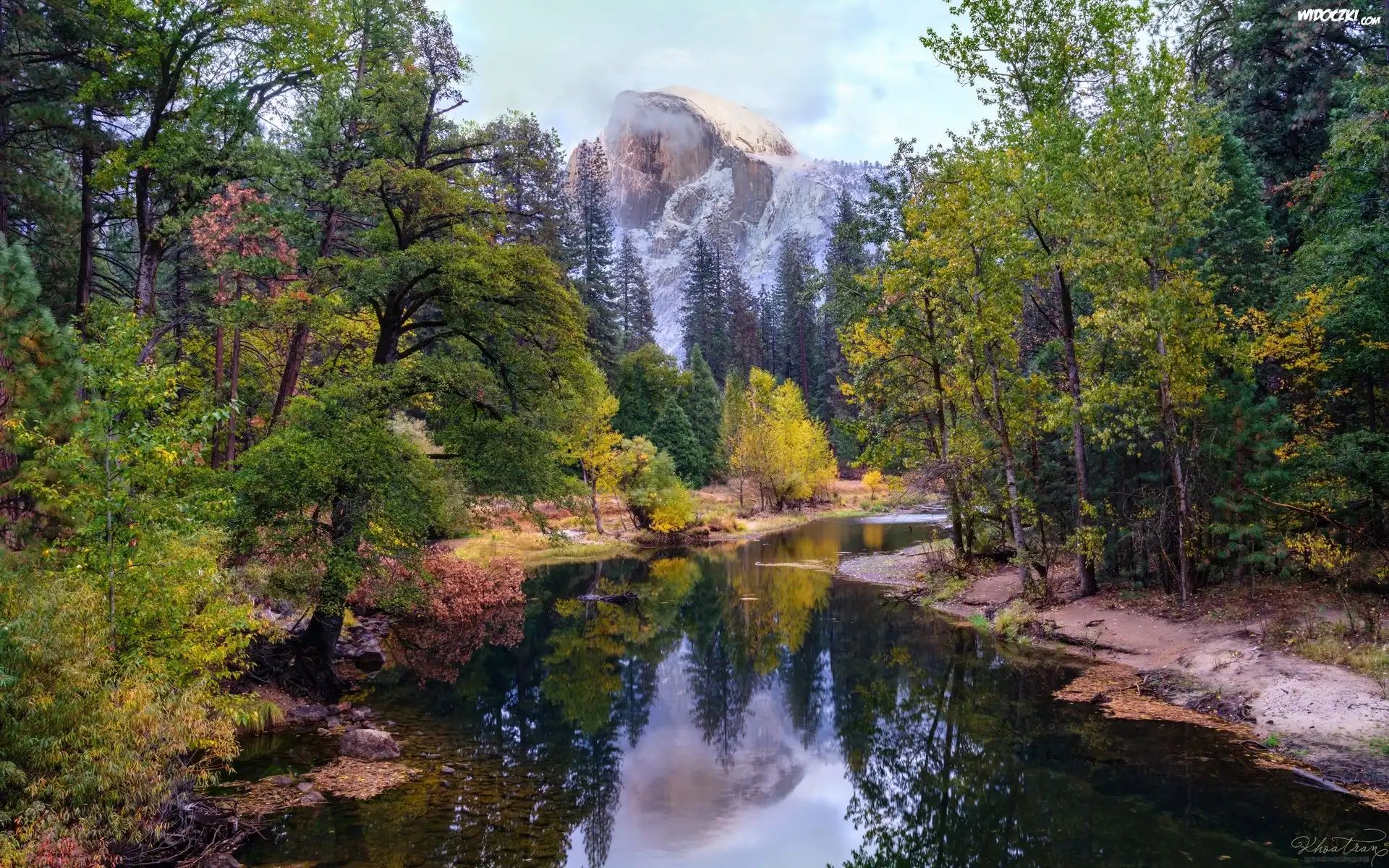 Stany Zjednoczone, Kalifornia, Park Narodowy Yosemite, Góry, Szczyt, Half Dome, Rzeka, Merced River, Drzewa |