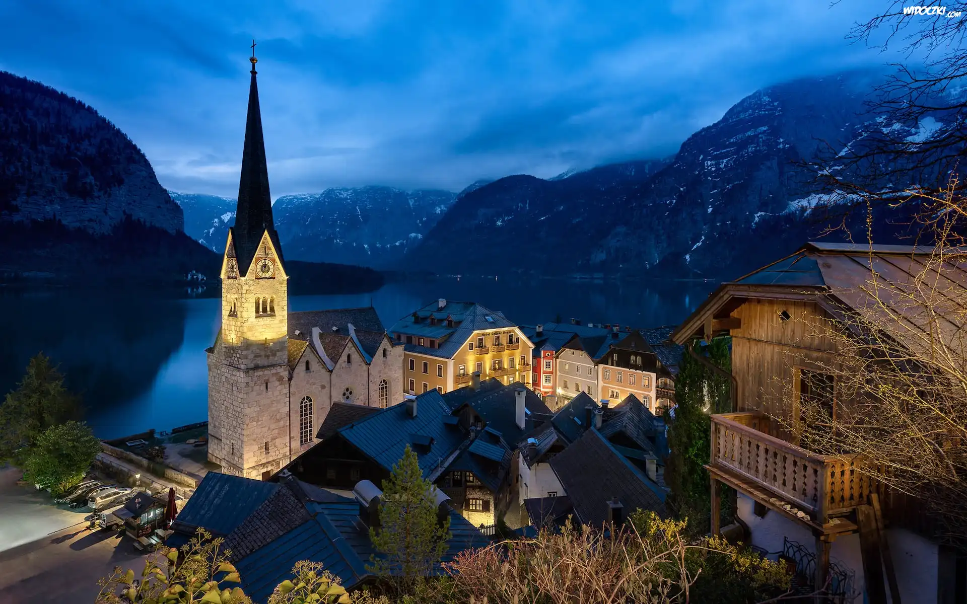 Zdjęcia, Austria, Hallstatt, Domy, Kościół, Góry