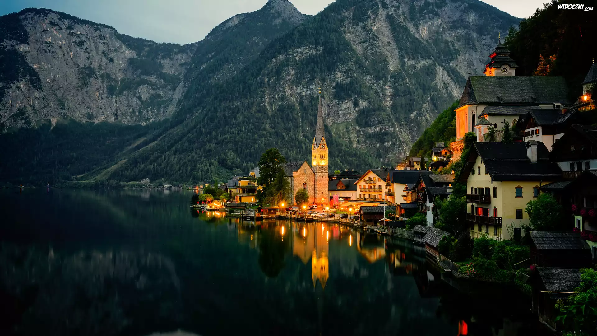 Austria, Hallstatt, Kościół, Jezioro Hallstättersee, Domy, Góry