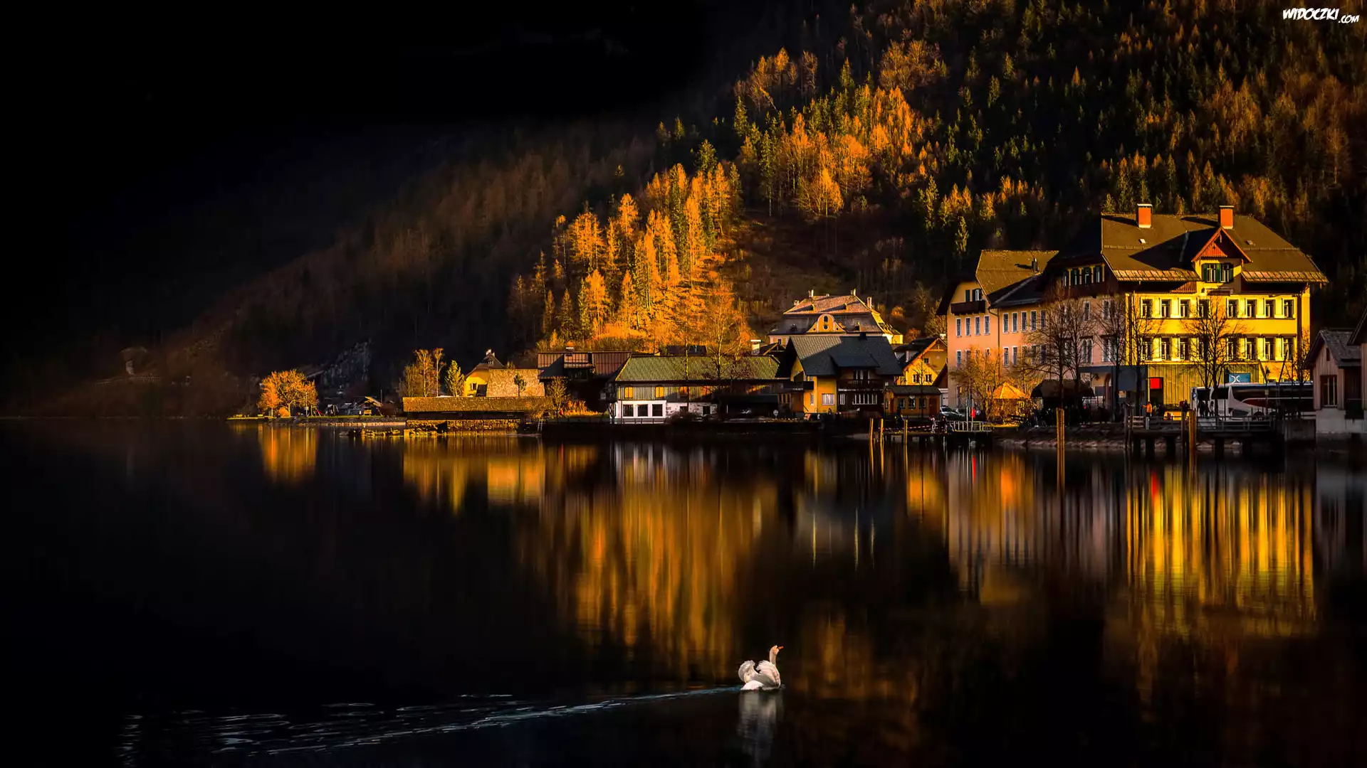 Zdjęcia, Austria, Miasteczko Hallstatt, Jezioro Hallstättersee, Góry Alpy Salzburskie, Domy, Łabędź