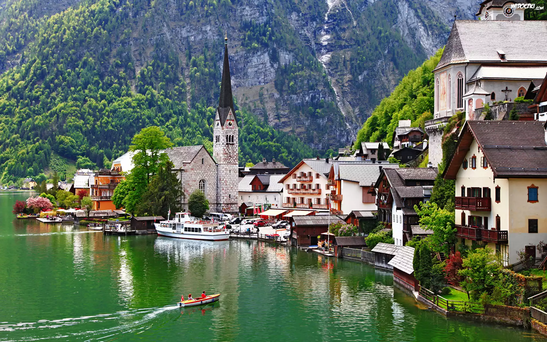Zdjęcia, Jezioro Hallstattersee, Kościół, Domy, Łodzie, Góry, Hallstatt, Austria