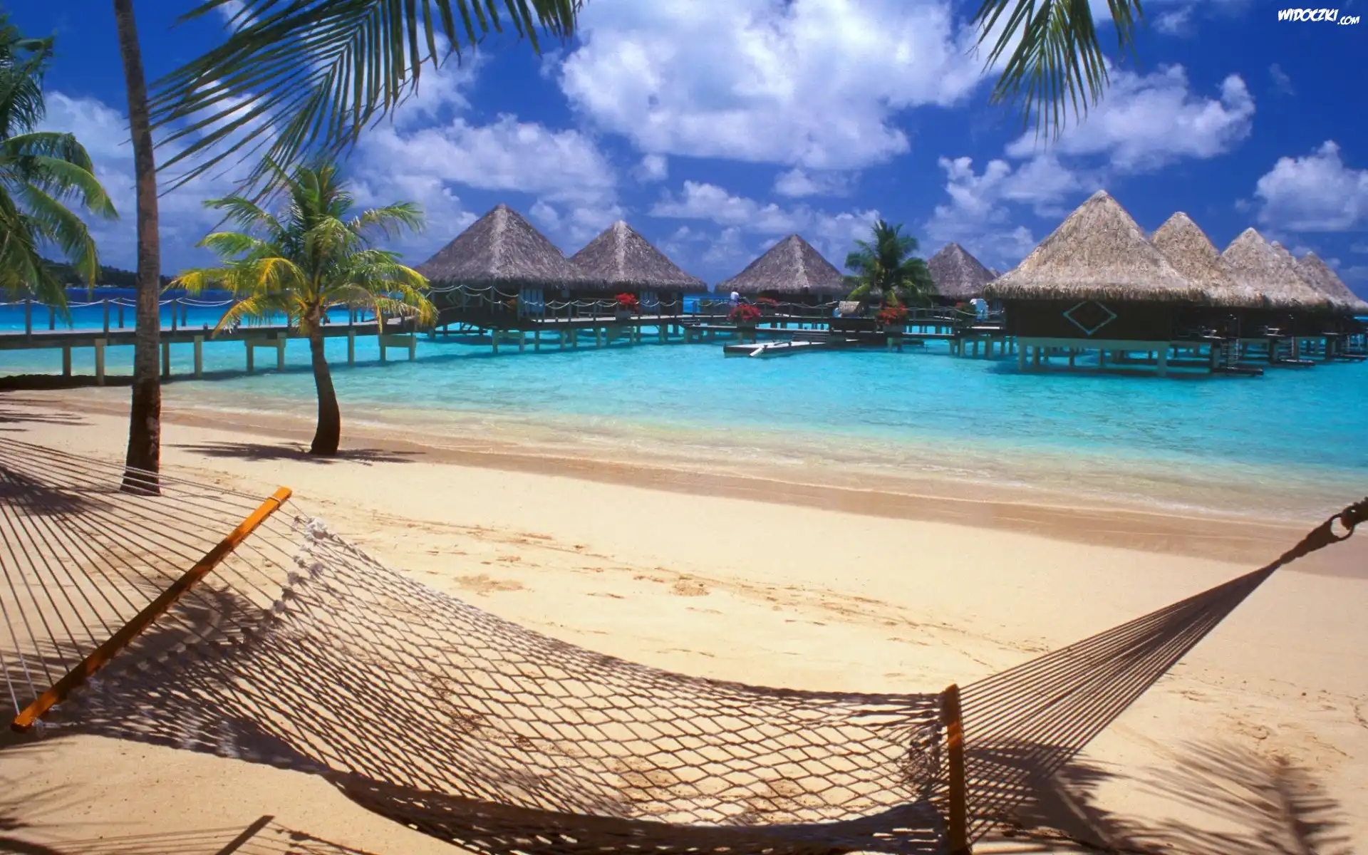 Plaża, Palmy, Hamak, Molo, Domy, Na, Palach, Bora Bora, Wyspa, Ocean