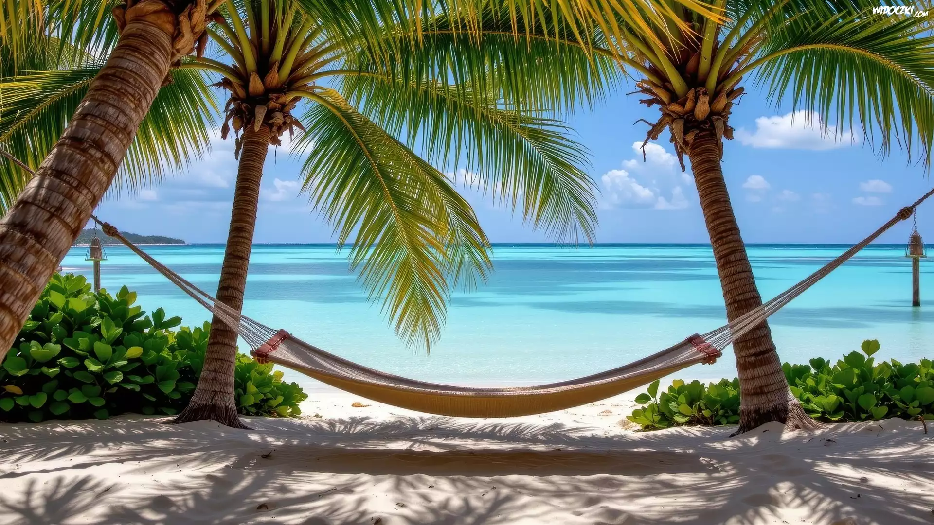 Trzy, Palmy, Morze, Hamak, Rośliny, Piasek