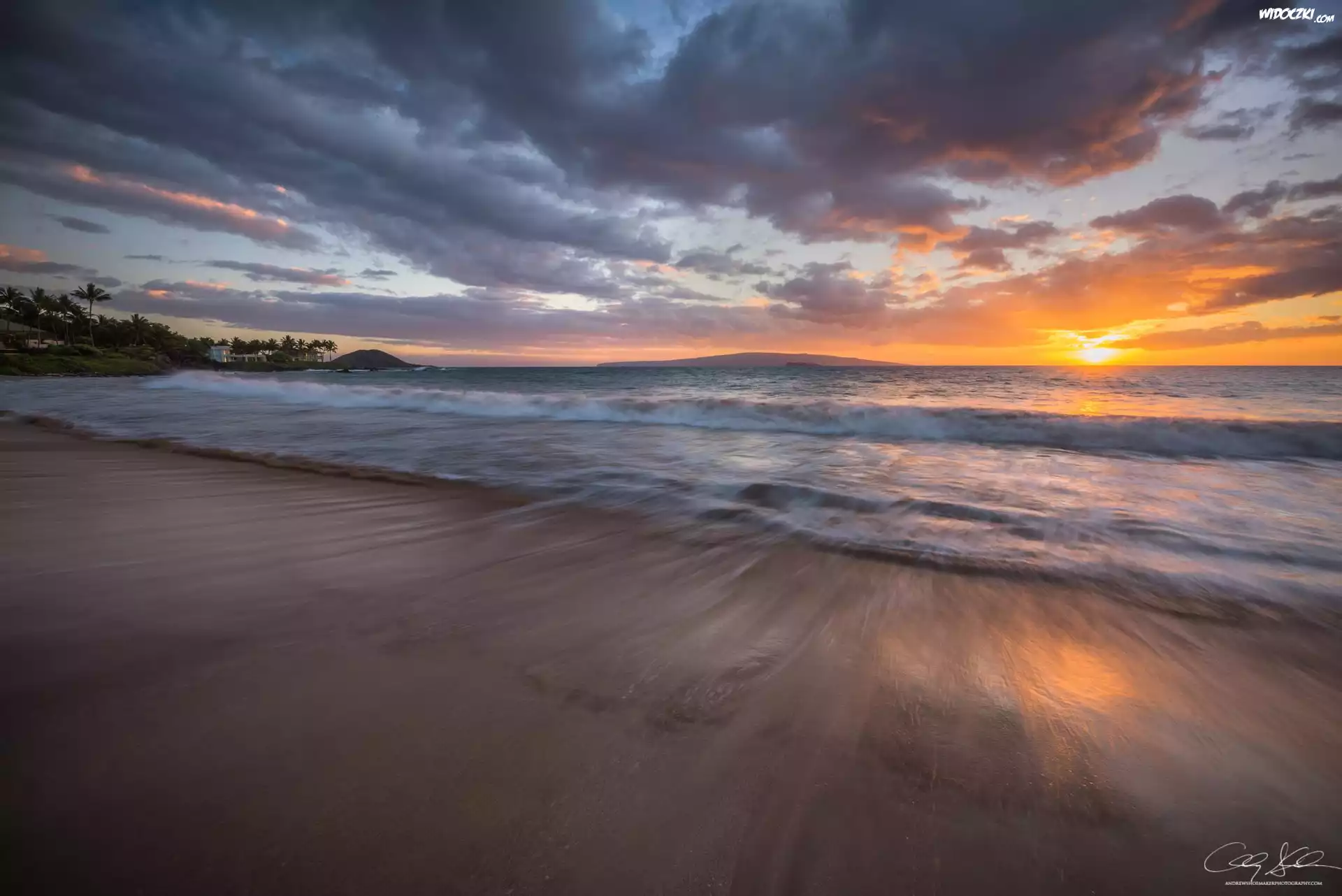 Hawaje, Morze, Zachód słońca, Chmury, Plaża