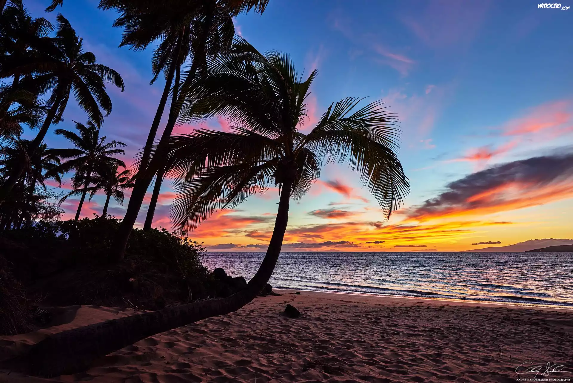Zdjęcia, Hawaje, Maui, Morze, Zachód słońca, Palmy