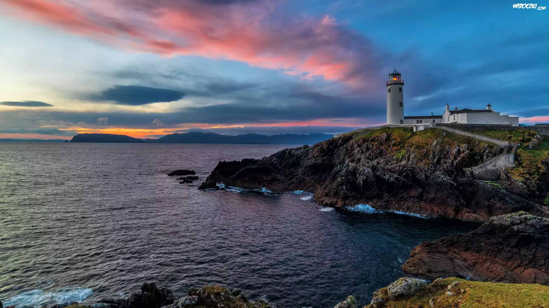Zdjęcia, Irlandia, Wybrzeże, Skały, Latarnia morska, Fanad Head Lighthouse, Morze, Chmury, Poranek