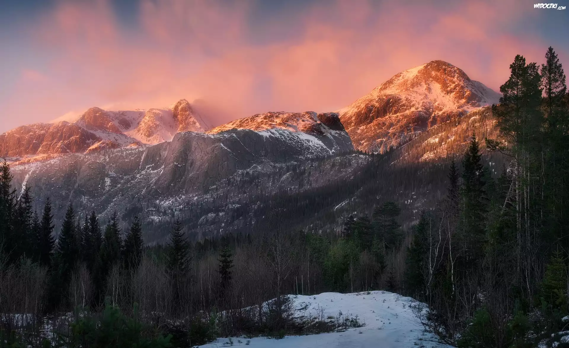 Zdjęcia, Norwegia, Region Austlandet, Gmina Hemsedal, Hemsedal Top 20 Góry, Drzewa, Różowe, Niebo