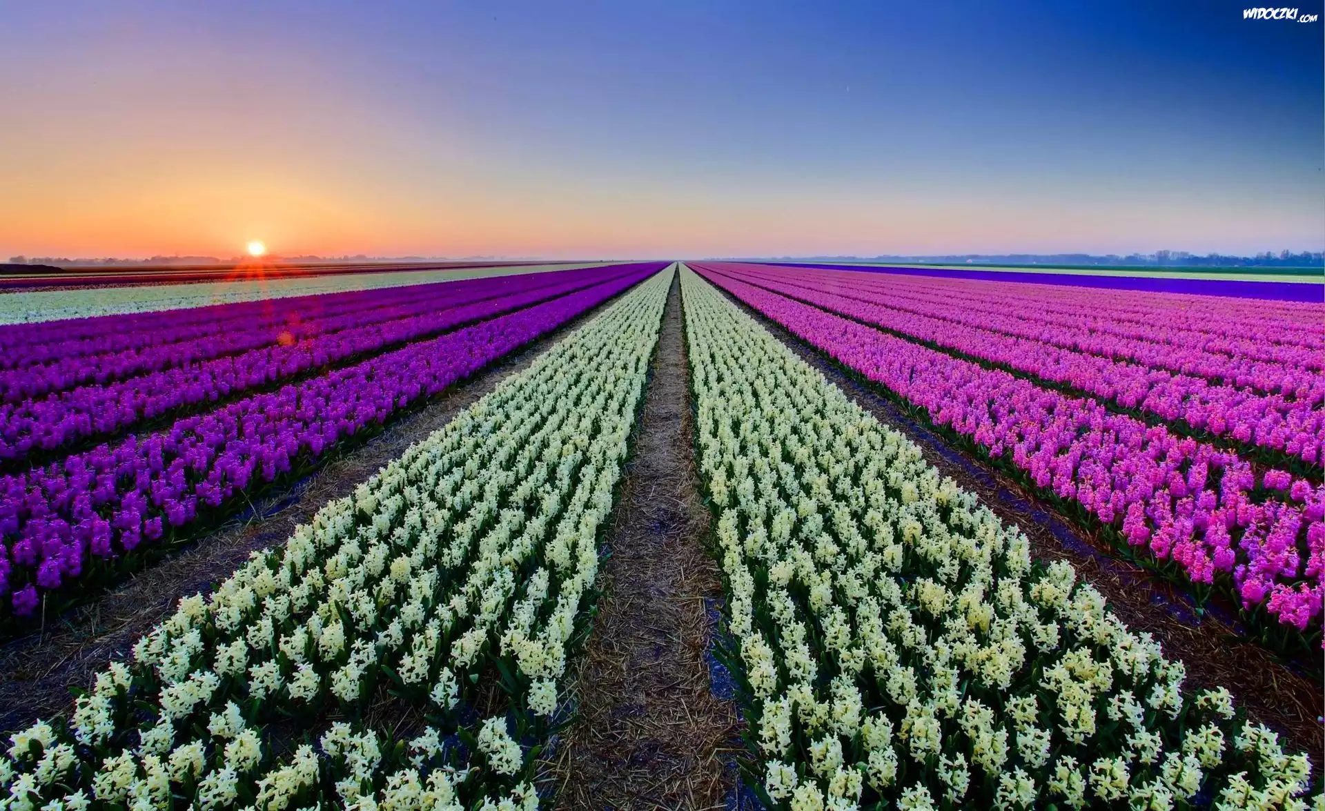 Zdjęcia, Hiacynty, Pole, Zachód Słońca