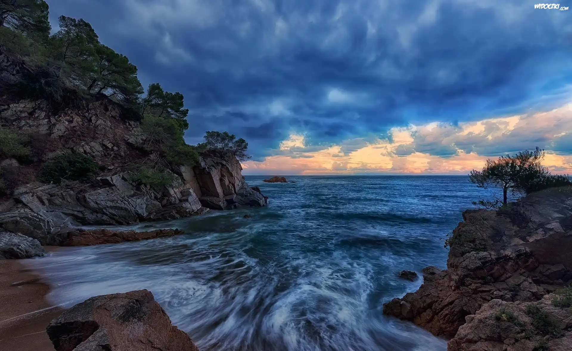 Hiszpania, Prowincja Girona, Costa Brava, Morze Śródziemne, Zatoka Cala Llevadó, Skały, Drzewa, Chmury |