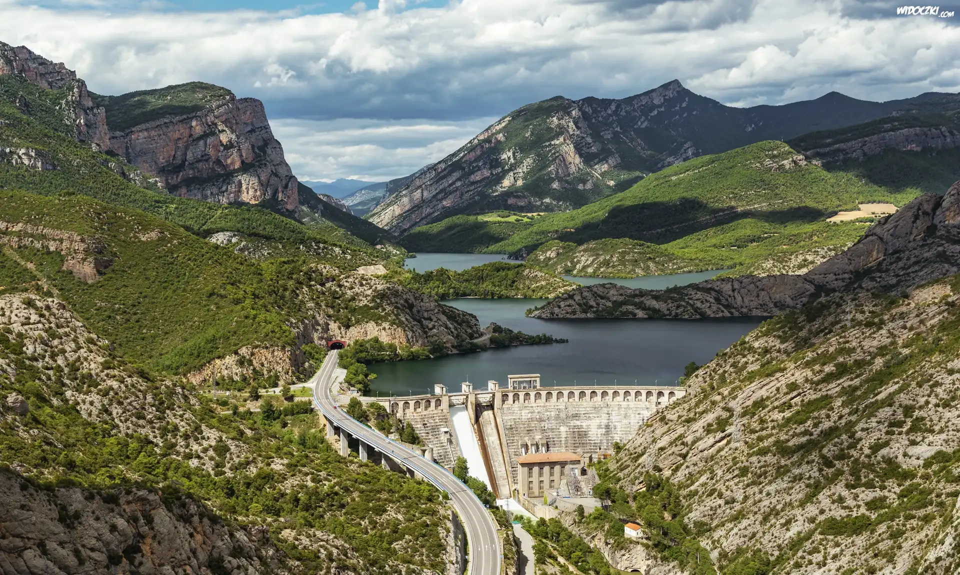 Hiszpania, Katalonia, Prowincja Lleida, Jeziora, Tama, Zapora, Zbiornik, Embalse de Oliana, Zapora, Most, Góry, Drzewa, Chmury |