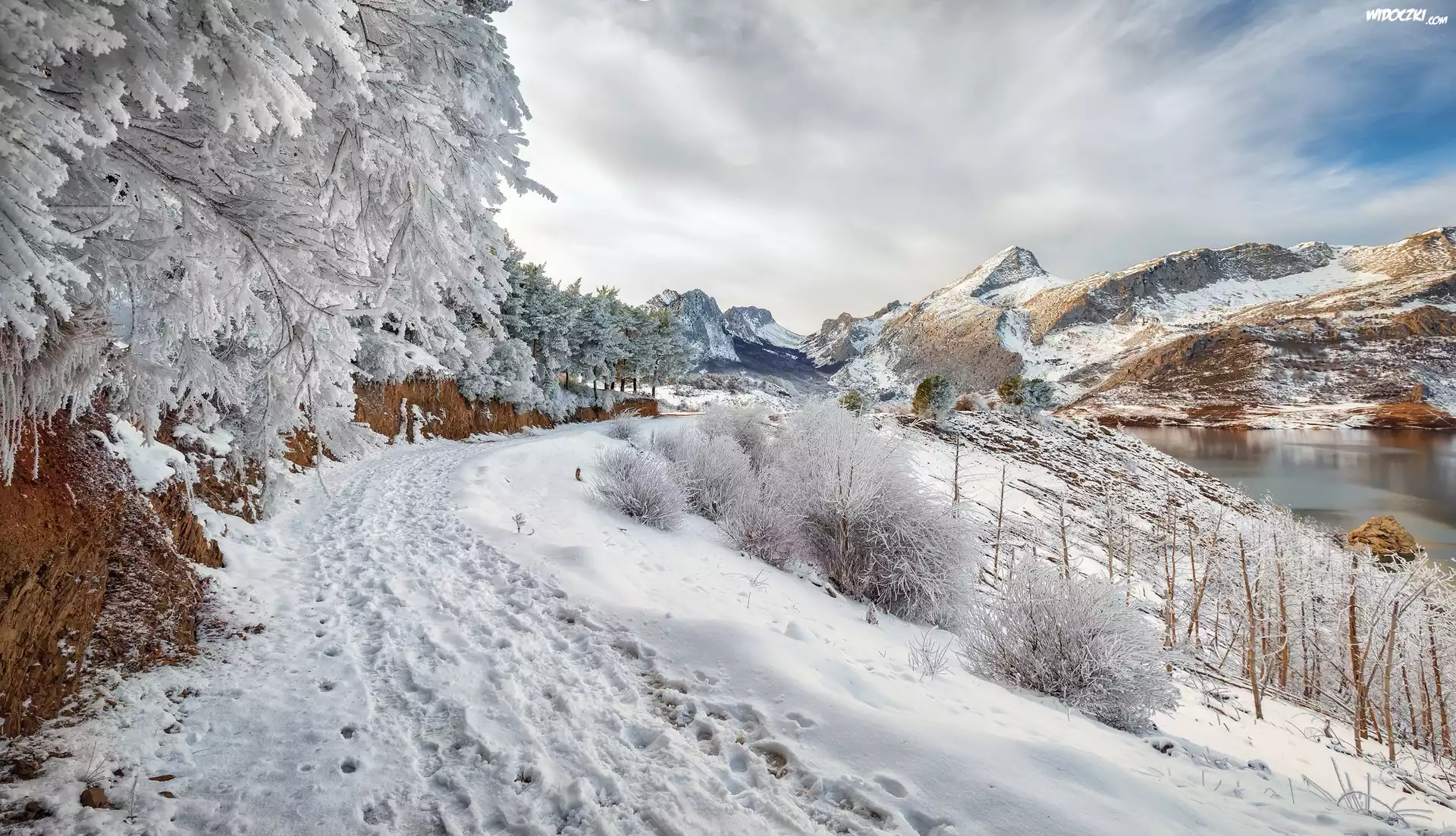 Zdjęcia, Hiszpania, Kastylia i León, Jezioro Embalse de Riaño, Zima, Droga, Oszronione, Drzewa, Góry