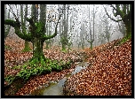 Zdjęcia, Hiszpania, Park Narodowy Gorbea, Las, Mgła, Strumień, Drzewa, Omszałe, Korzenie