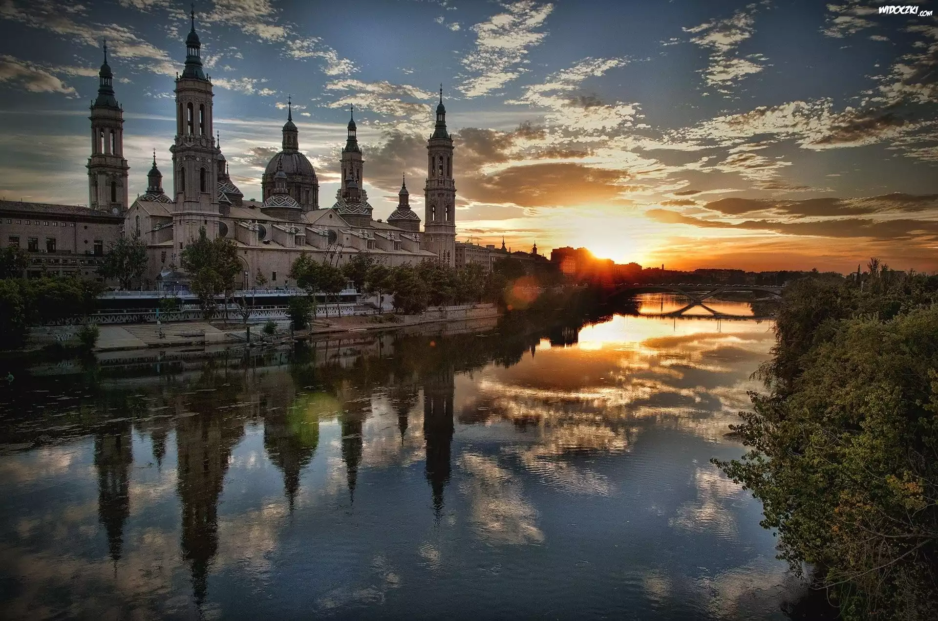 Zdjęcia, Hiszpania, Saragossa, Kościół, Rzeka, Zachód Słońca