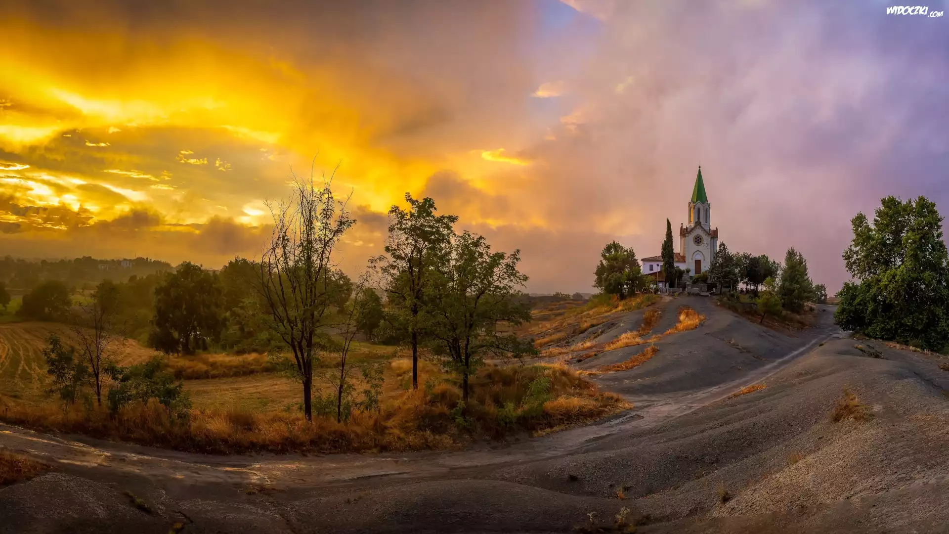 Zdjęcia, Hiszpania, Gmina Manlleu, Kościół Santuari Puig Agut, Drzewa, Zachód słońca