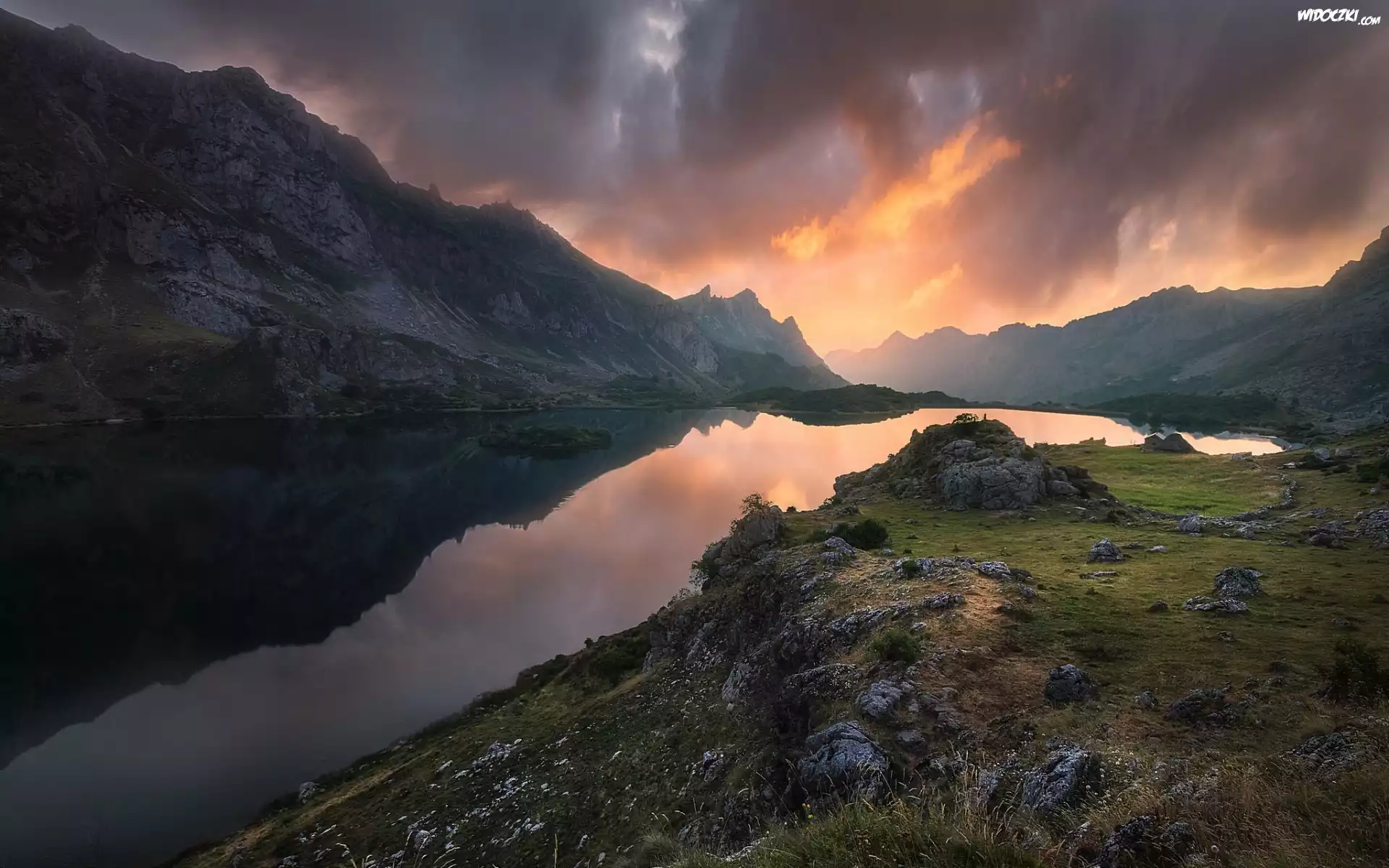 Hiszpania, Asturia, Rezerwat przyrody Somiedo Natural Park, Valle de Lago, Jezioro, Góry Kantabryjskie, Zachód słońca |
