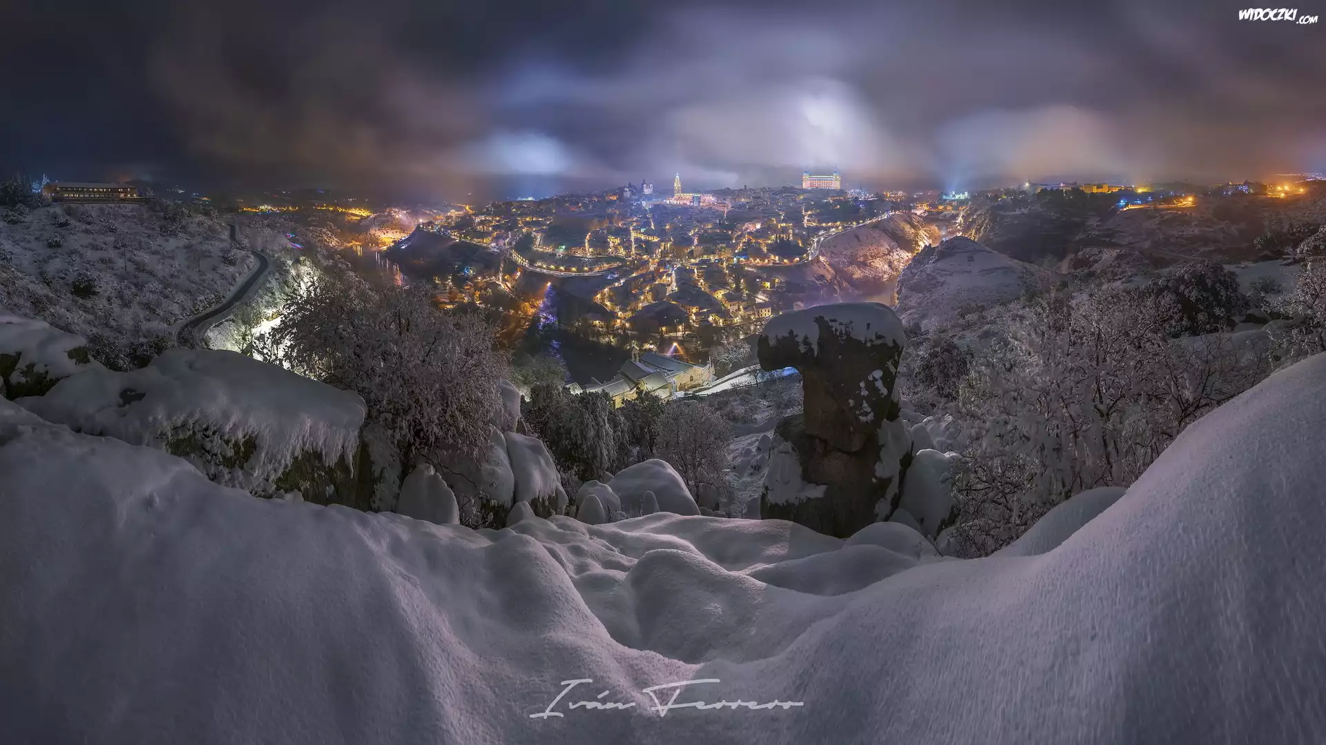 Zdjęcia, Zima, Noc, Zaśnieżone, Drzewa, Wzgórze, Oświetlone, Miasto, Toledo, Hiszpania