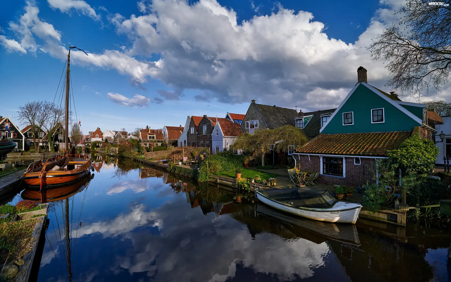 Zdjęcia, Holandia, Edam, Niebo, Chmury, Domy, Rzeka, Kanał wodny, Łodzie, Odbicie