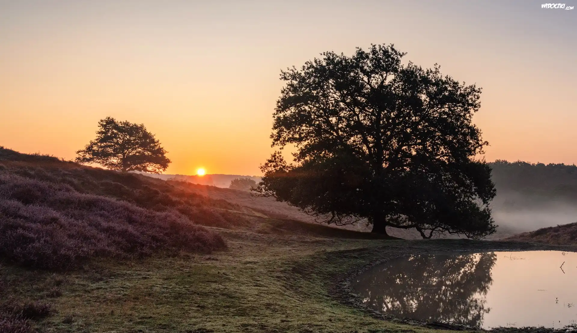 Holandia, Prowincja Geldria, Rheden, Park Narodowy Veluwezoom, Wschód słońca, Mgła, Drzewa, Wrzosowisko, Staw |