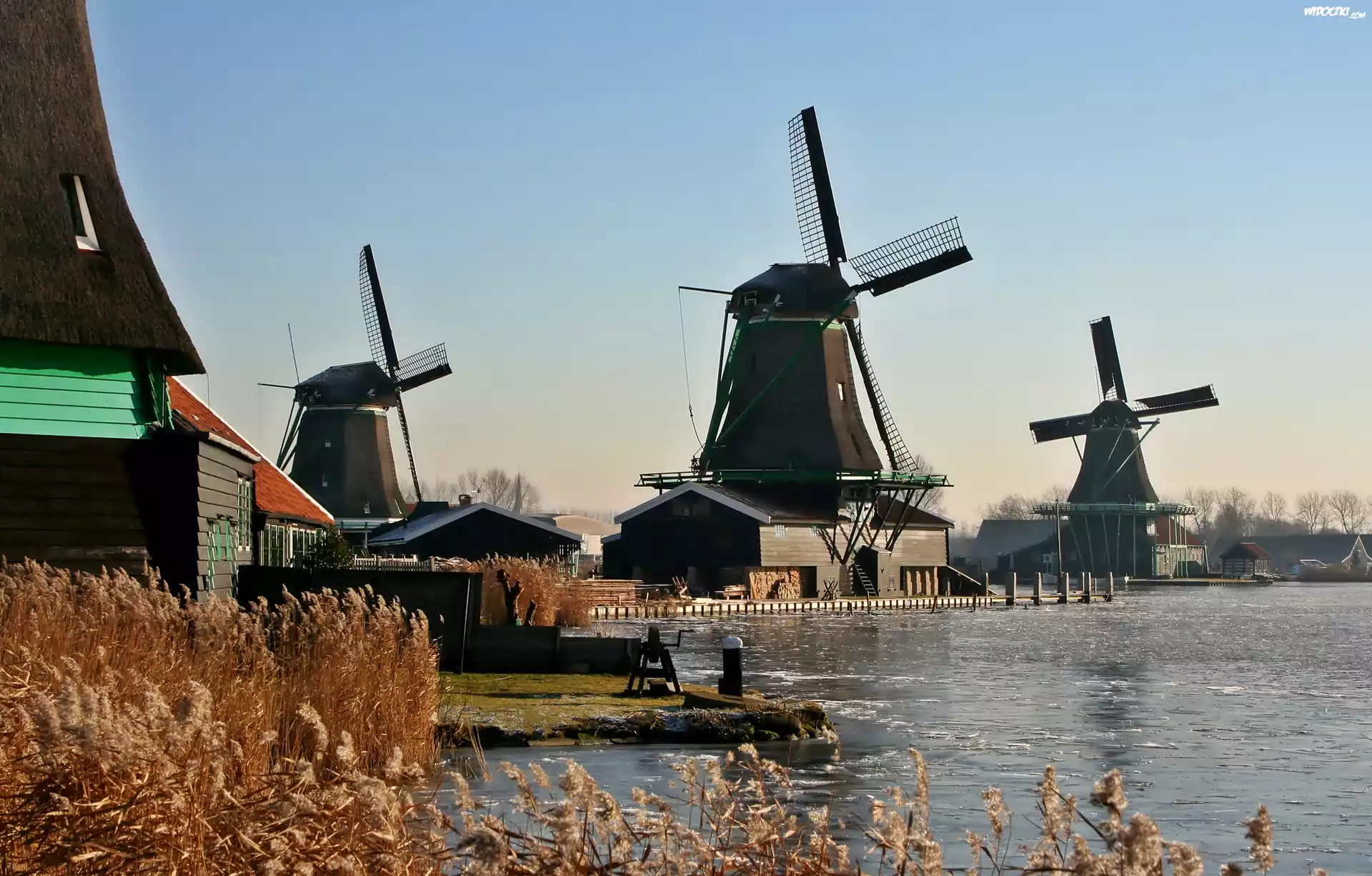 Zdj臋cia, Holandia, Wiatraki, Rzeka, Szuwary