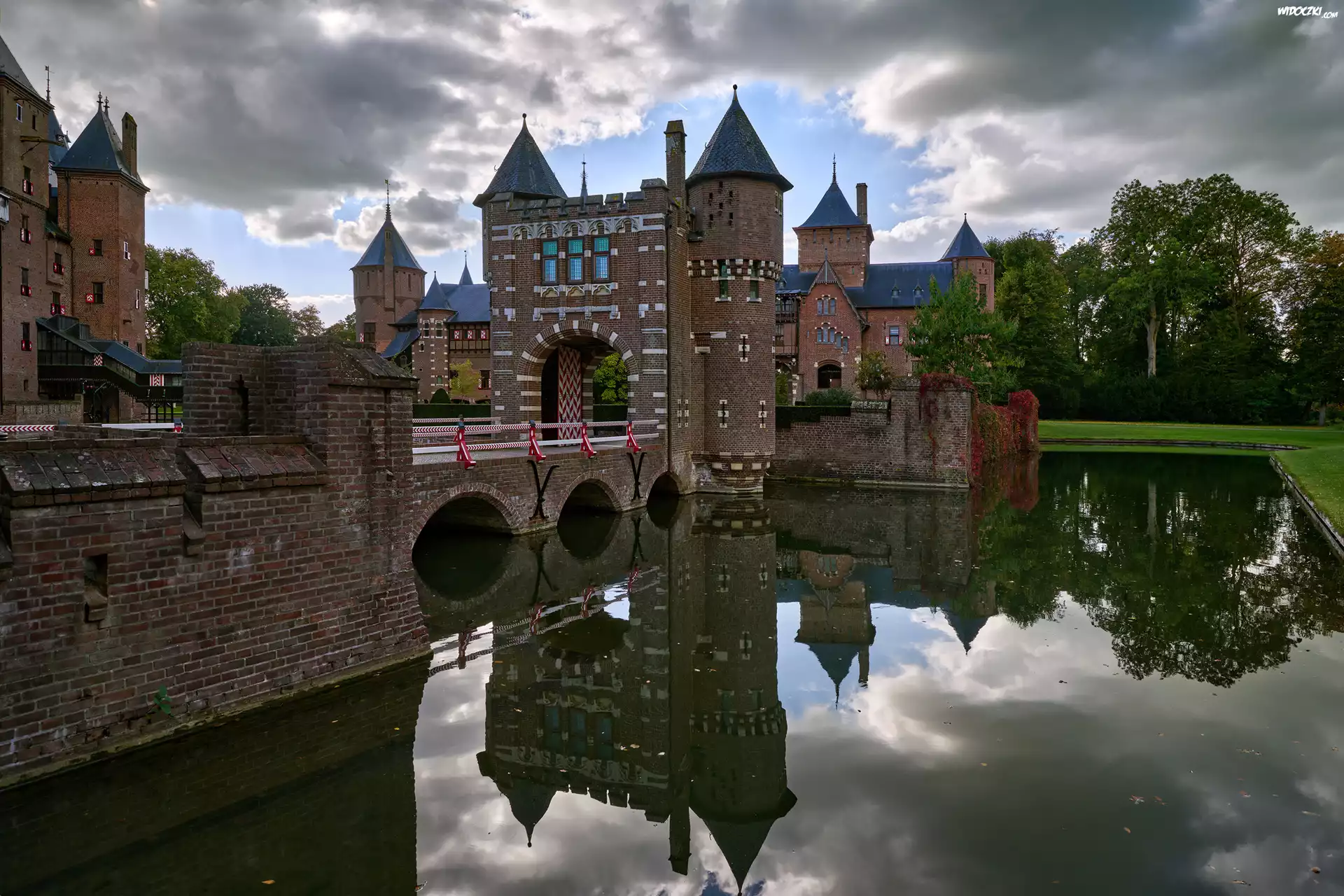 Holandia, Utrecht, Zamek, Castle De Haar, Wieża, Most, Staw, Odbicie