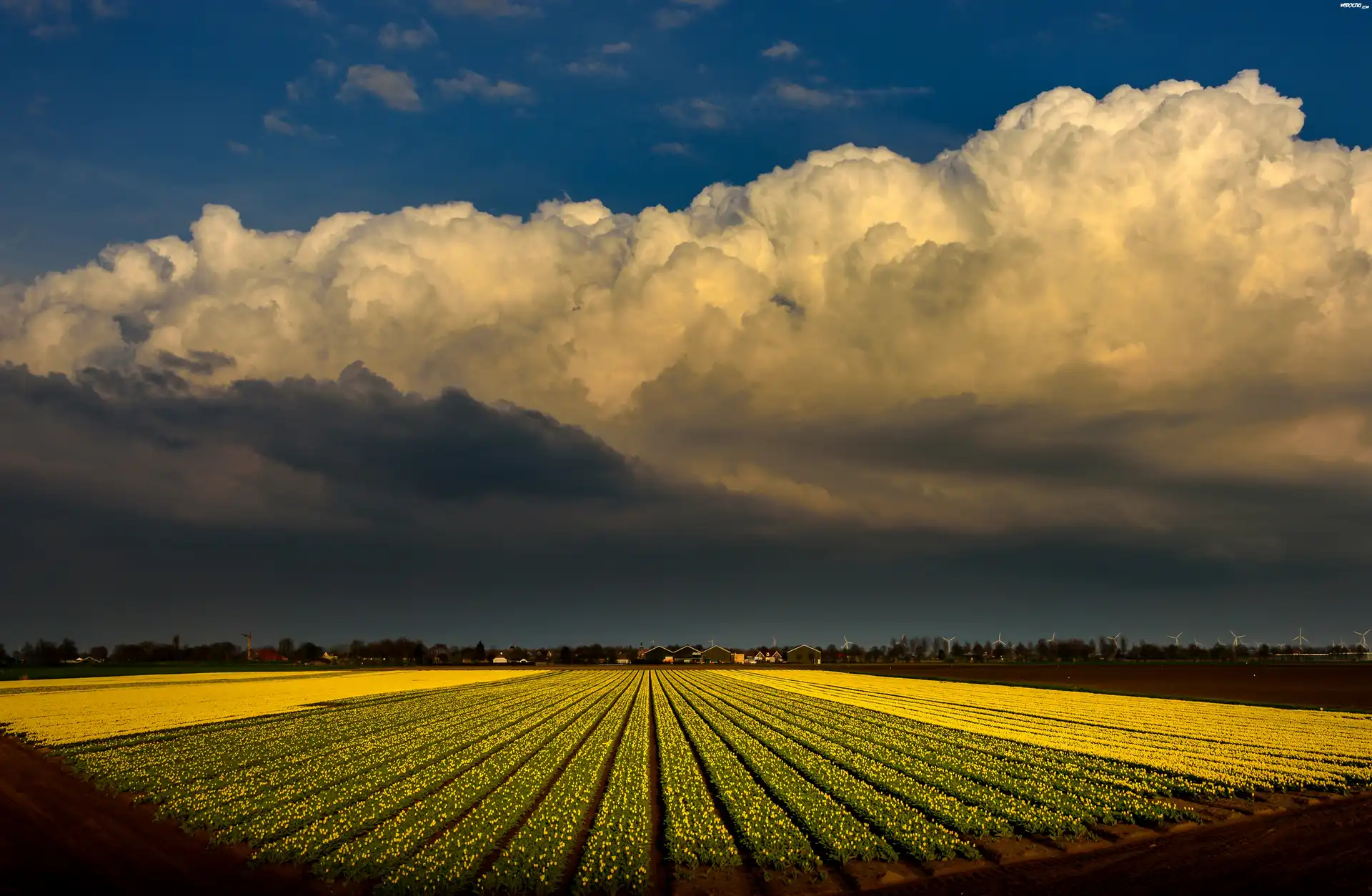 Holandia, Pole, Żółte, Tulipany, Chmury