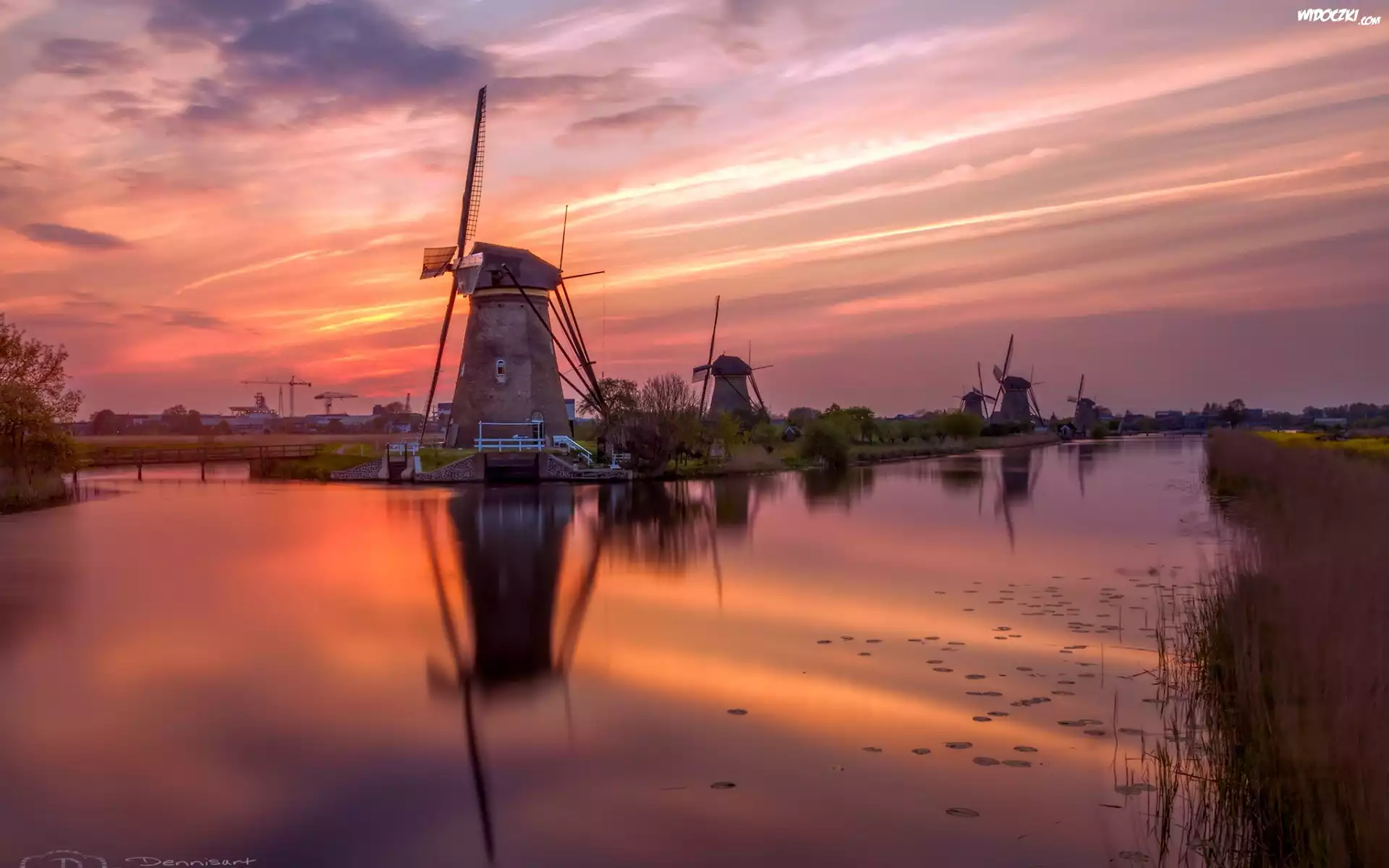 Zdjęcia, Holandia, Zachód słońca, Wiatraki, Rzeka