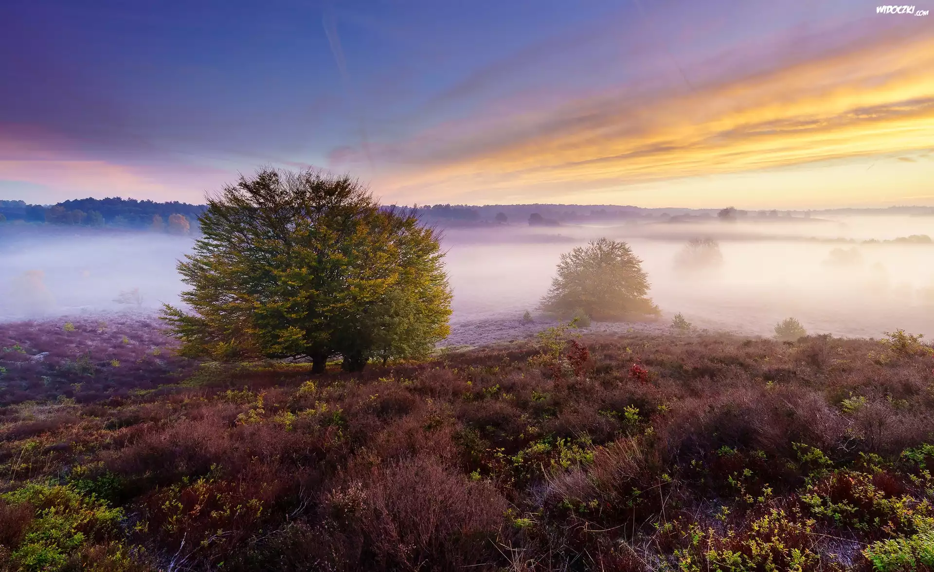 Zdjęcia, Park Narodowy Veluwezoom, Wrzosowisko, Wrzosy, Drzewa, Mgła, Prowincja Geldria, Holandia