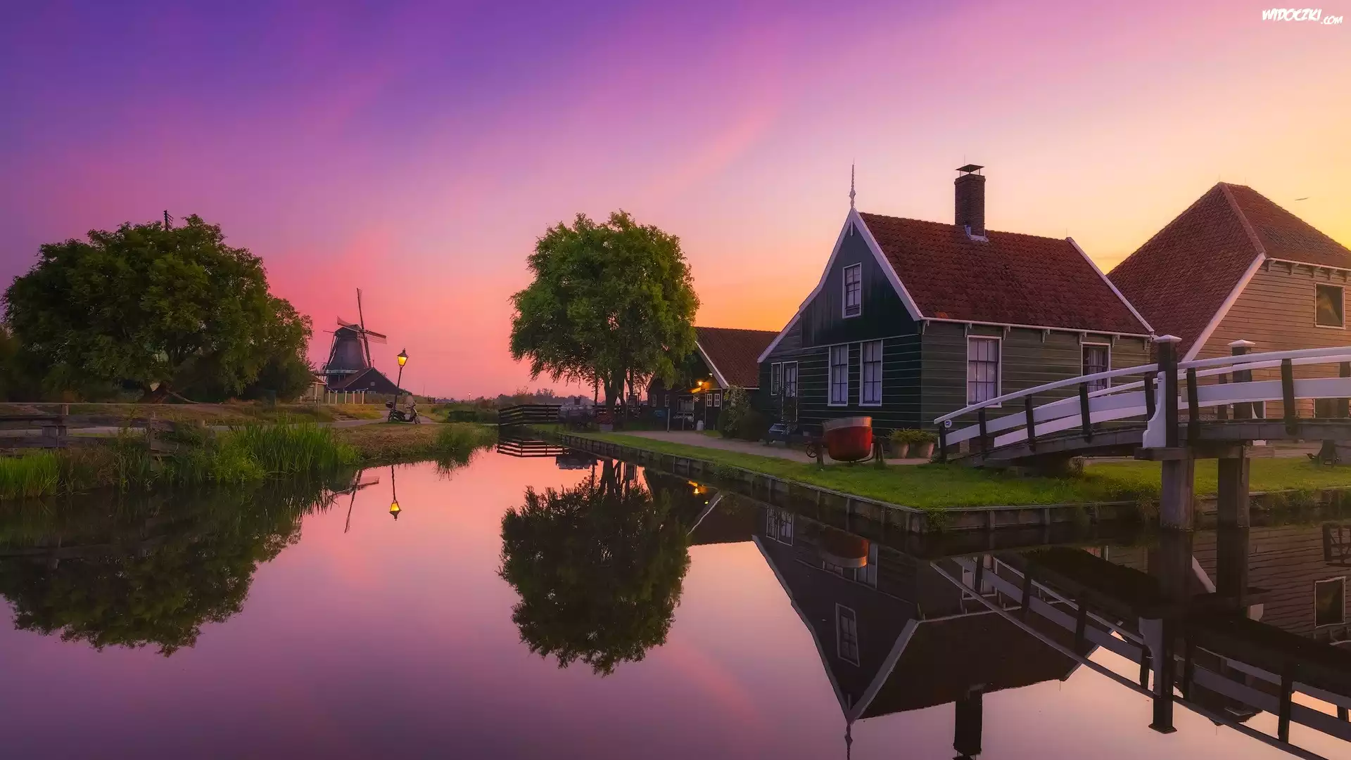 Zdjęcia, Holandia, Skansen, Zaanse Schans, Wiatrak, Domy, Most, Rzeka, Zachód słońca