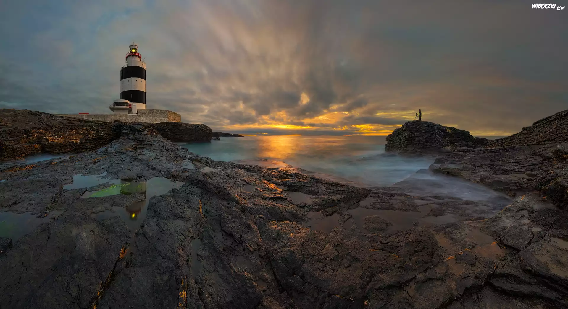 Zdjęcia, Latarnia morska Hook Head, Morze, Skały, Chmury, Zachód słońca, Wexford, Irlandia