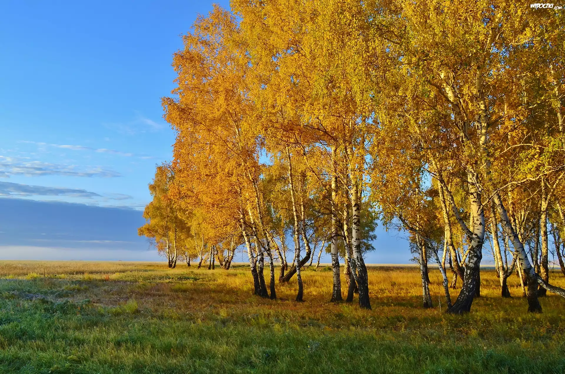 Zdjęcia, Łąki, Brzozy, Horyzont, Jesień
