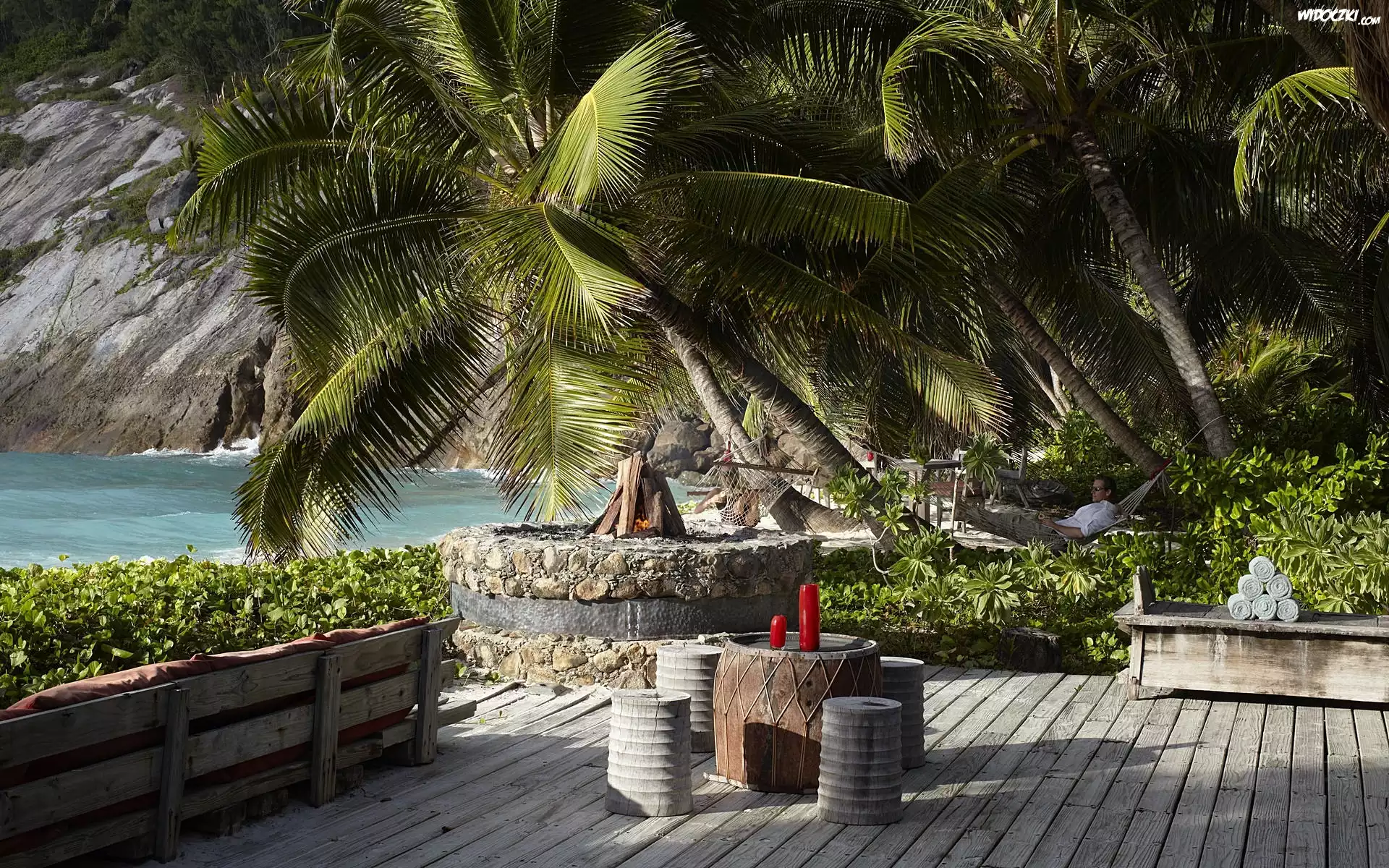 Zdjęcia, Hotel, Taras, Palmy, Ocean, Skały, Seszele