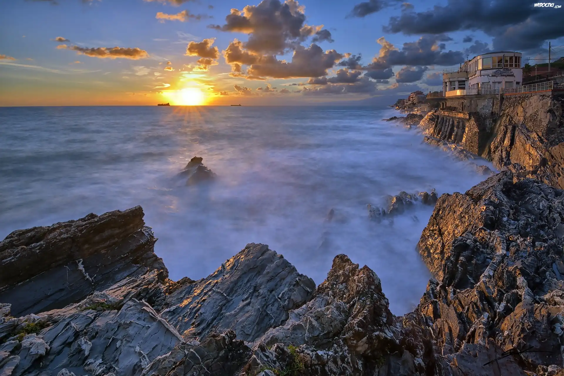 Hotel, Morze, Skały, Zachód Słońca