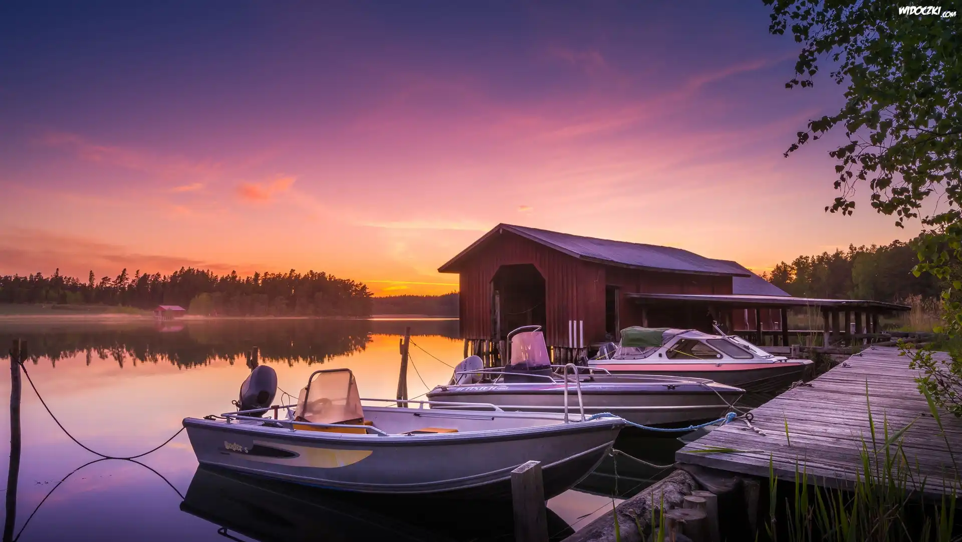 Zdjęcia, Finlandia, Wyspa Houtskari, Jezioro Viken, Przystań, Motorówki, Pomost, Szopa, Zachód słońca
