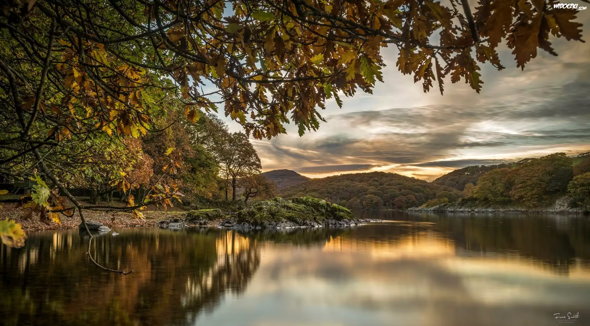 Zdjęcia, Anglia, Hrabstwo Kumbria, Drzewa, Wzgórza, Jezioro Coniston Lake