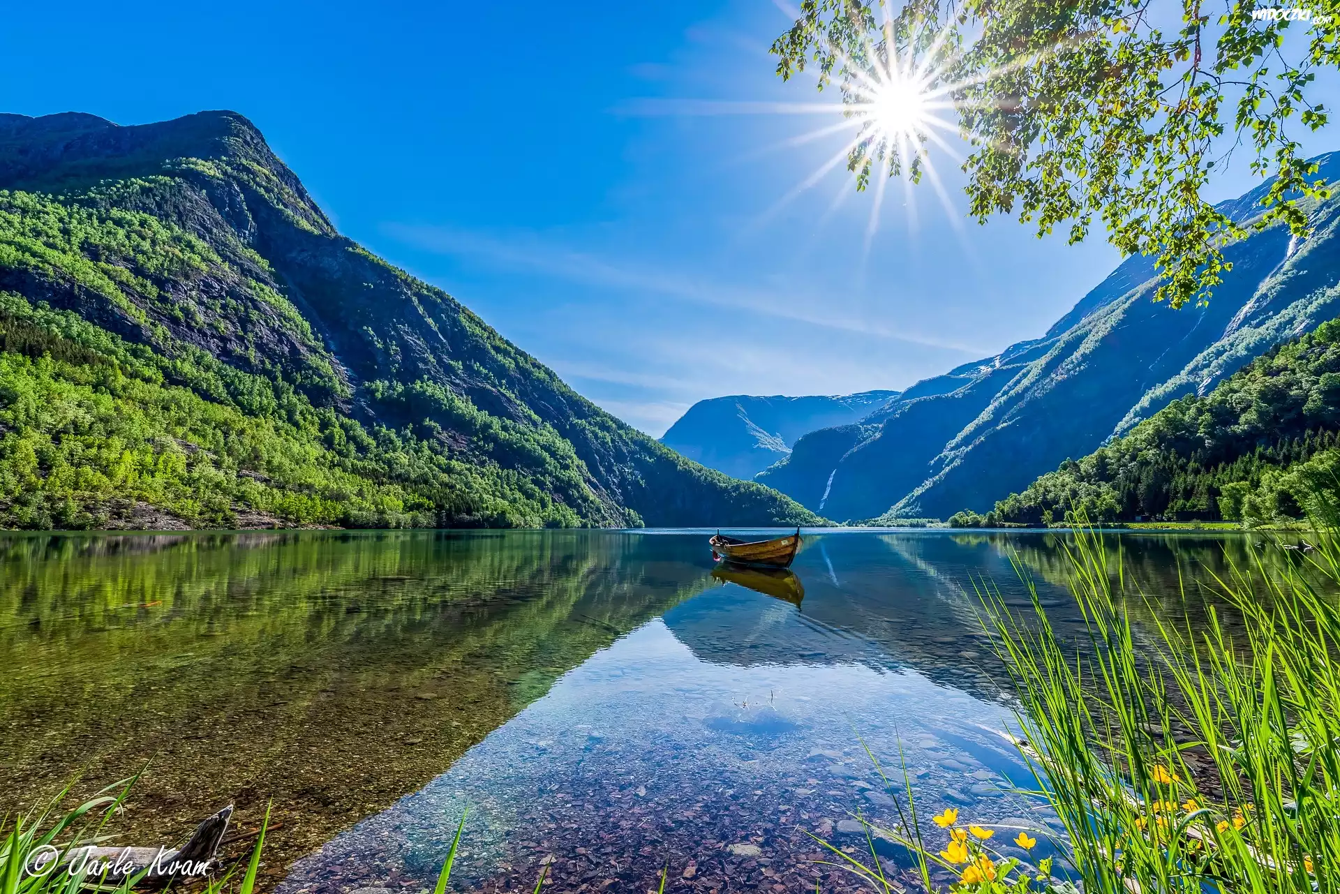Góry, Jezioro, Łódka, Promienie słońca, Wieś Skjolden, Gmina Luster, Hrabstwo Vestland, Norwegia