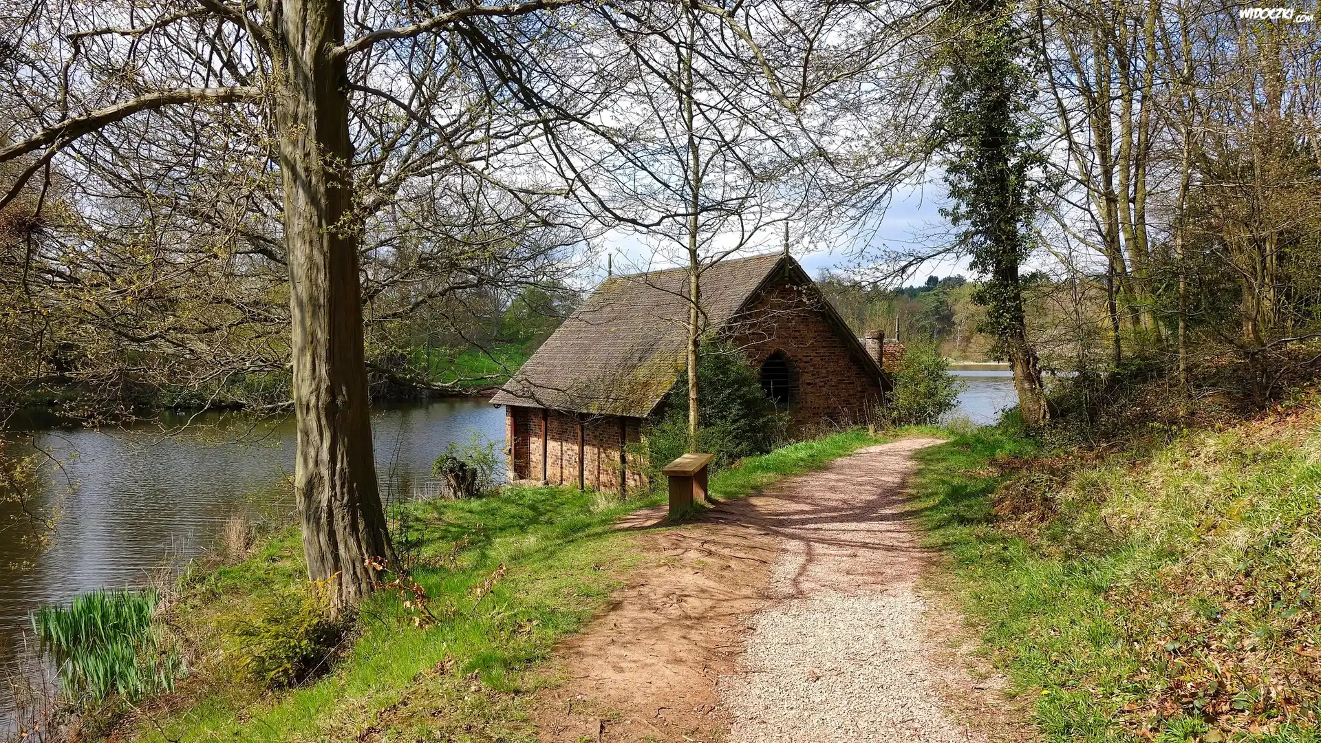 Zdjęcia, Droga, Dom, Przystań, Jezioro, Dudmaston Big Pool, Dudmaston Estate, Hrabstwo Shropshire, Anglia