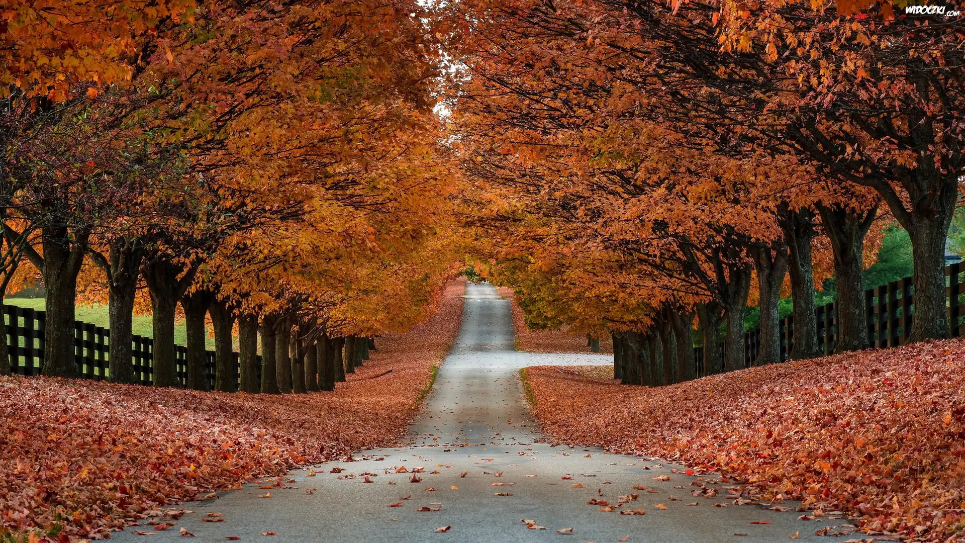 Stany Zjednoczone, Stan Kentucky, Hrabstwo Woodford County, Miasto Lexington, Jesień, Drzewa, Droga, Ogrodzenie, Liście |