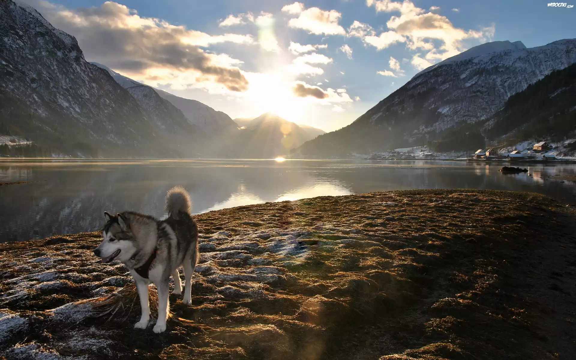 Husky, Jezioro, Góry, Promienie, Słońca, Chmury