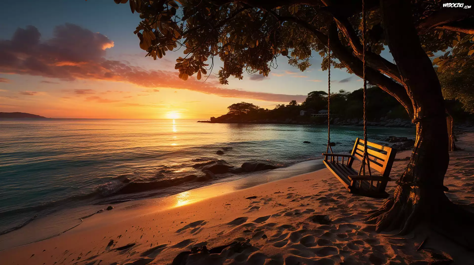 Morze, Plaża, Drzewo, Huśtawka, Zachód słońca