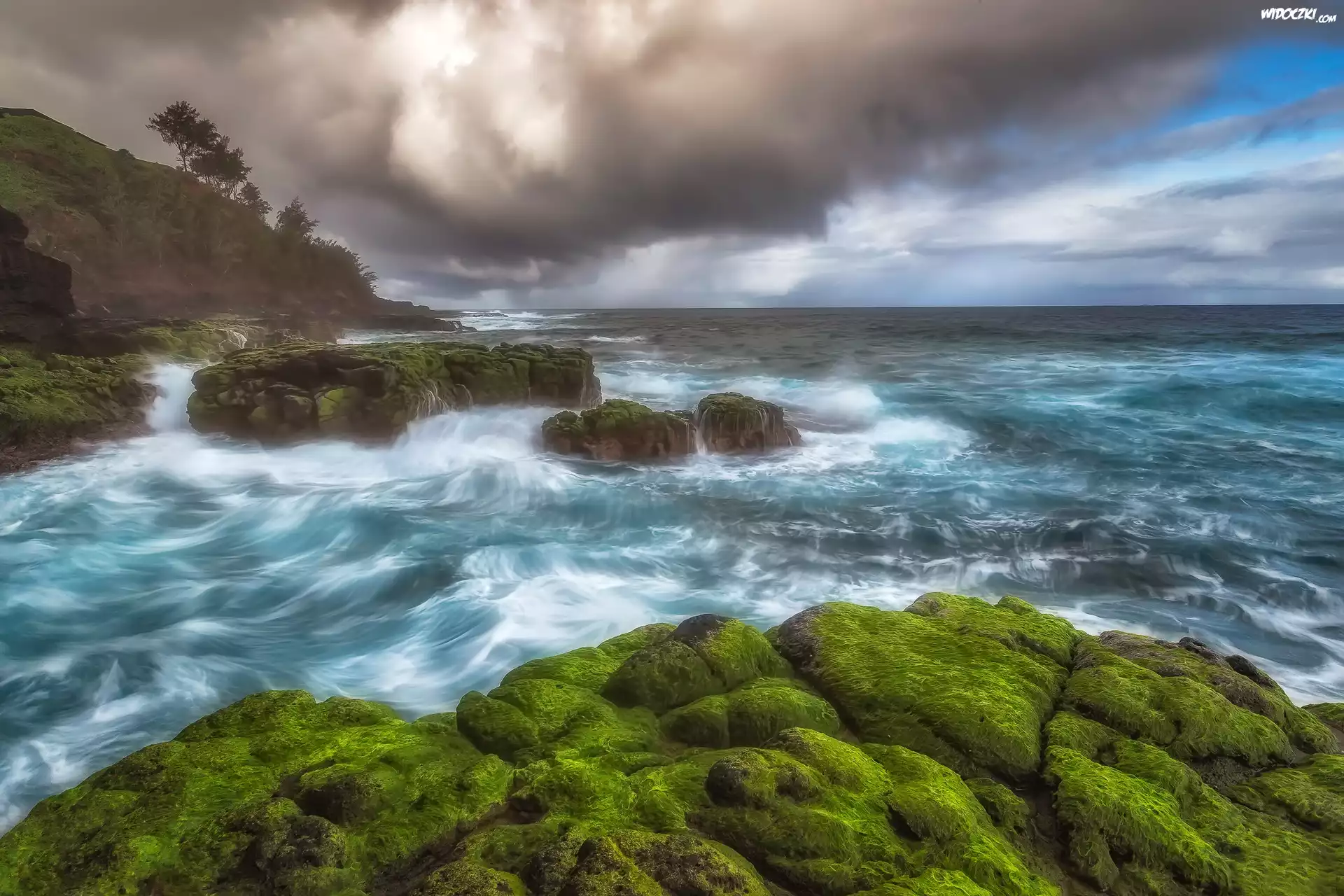 Hawaje, Wybrzeże, Wyspa Kauaʻi, Ocean Spokojny, Drzewa, Chmury, OmszaÅ‚e, SkaÅ‚y