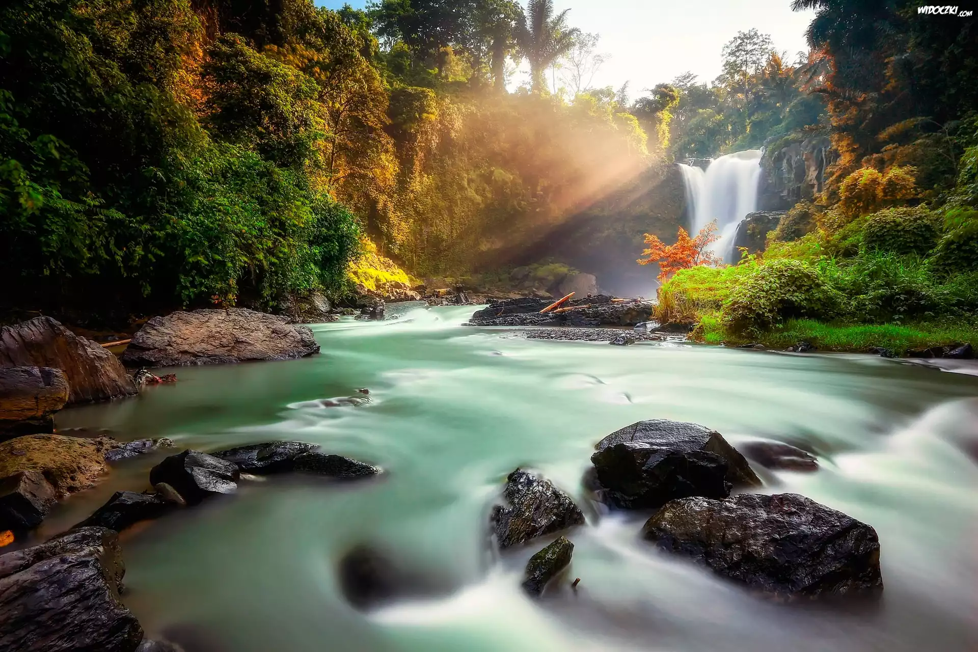 Indonezja, Wyspa Bali, Wioska Tegenungan Kemenuh, Wodospad Tegenungan, Rzeka, Skały, Kamienie, Roślinność, Drzewa |