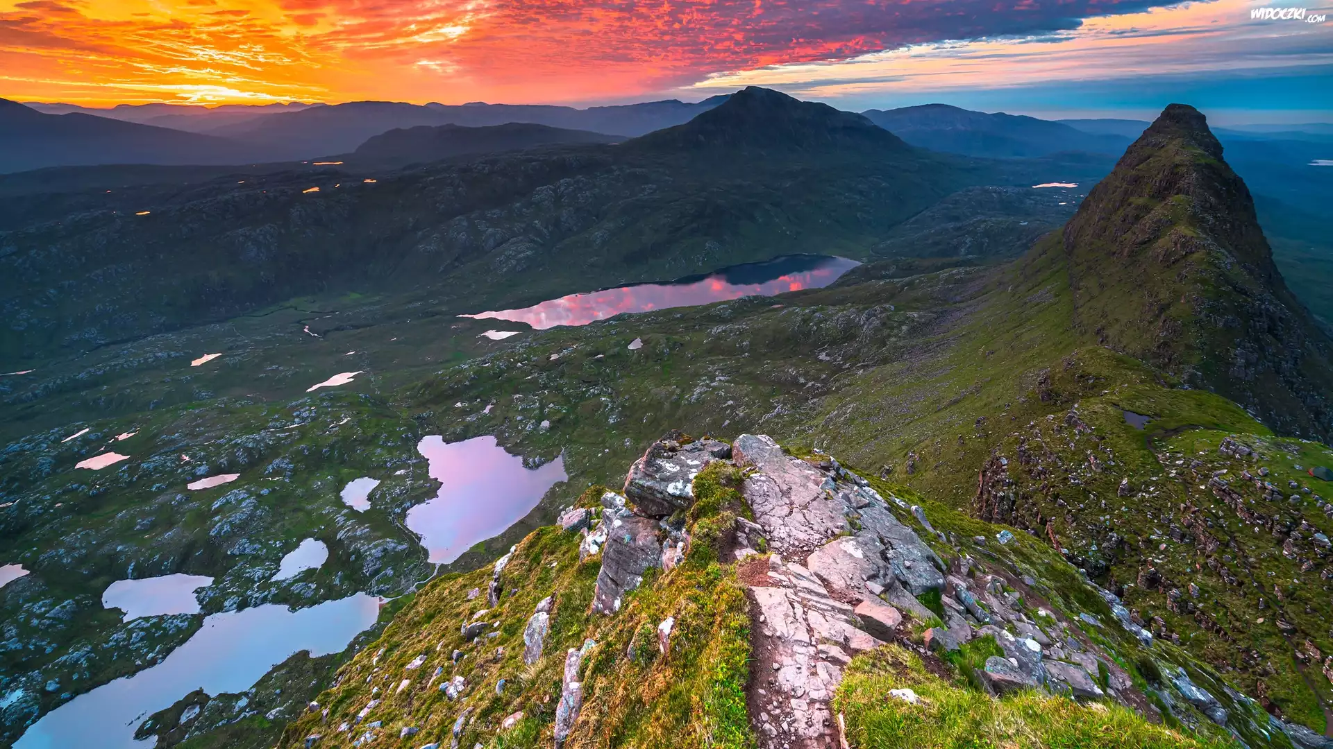 Zdjęcia, Szkocja, Assynt, Góra Suilven, Skały, Wschód słońca, Region Inverpolly