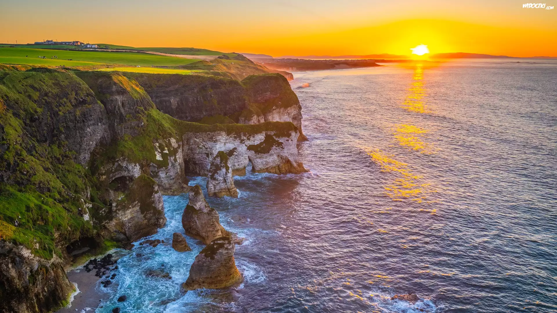 Zdjęcia, Irlandia Północna, Hrabstwo Antrim, Morze, Wybrzeże, Klif, Zachód słońca, Skały
